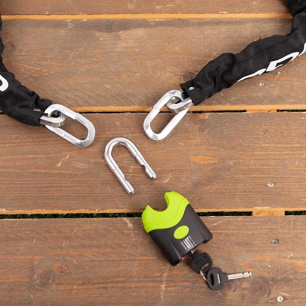 De Edge Scooty is uitgevoerd in het zwart. De schakels hebben een dikte van 10 mm en een breedte van 4 mm. Rondom de ketting zit een hoes van textiel die uw vervoer beschermd tegen krassen. Het hangslot is waterbestendig en net als de ketting gemaakt van gehard staal. Om uw slot te beschermen tegen vocht en vuil is er een beschermkapje aangebracht. Bij uw bestelling ontvangt u twee sleutels, welke over een sleutelnummer beschikken.