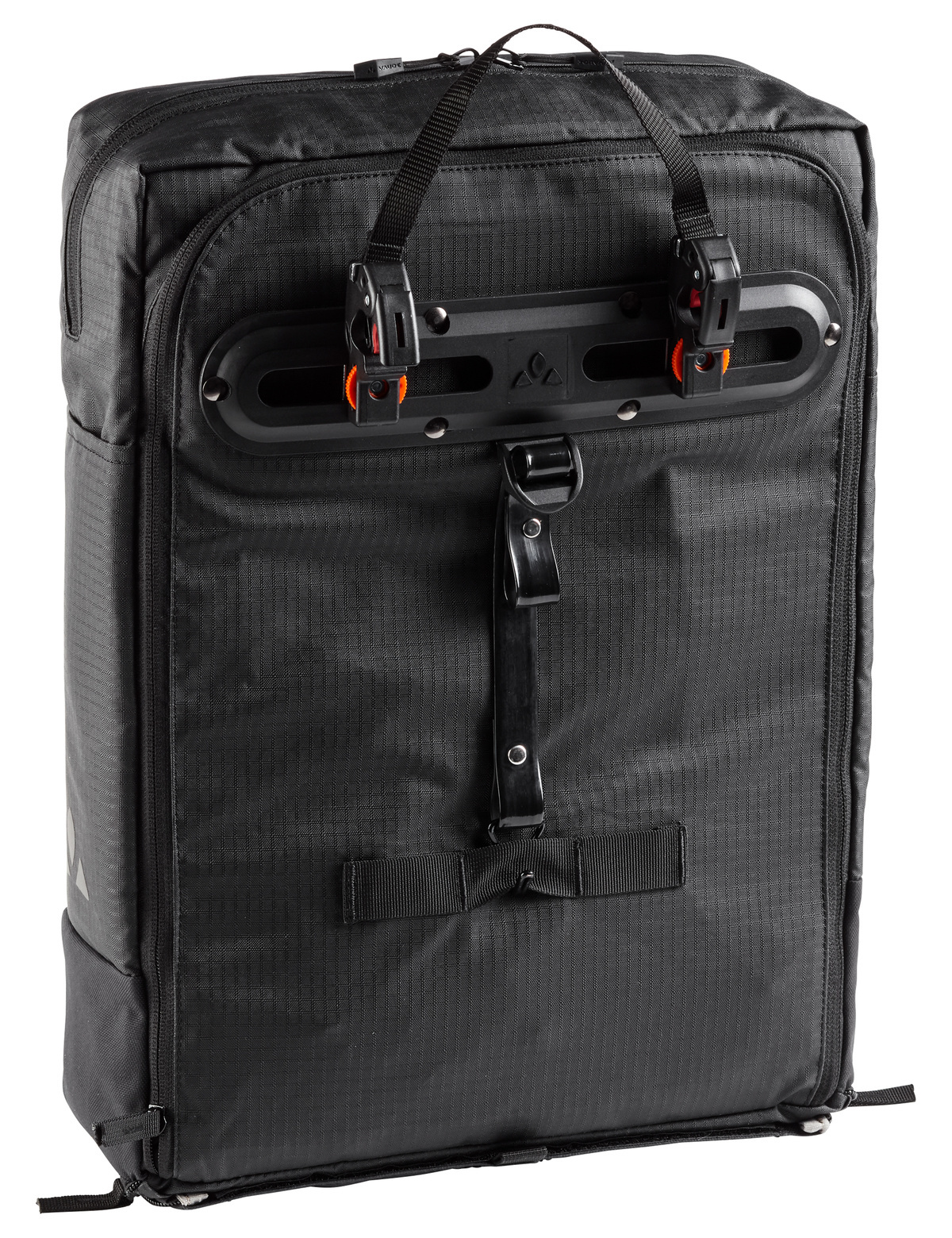 'Quick Mount Release' heet het unieke systeem van Vaude dat ervoor zorgt dat het afnemen van de tas letterlijk kan in één beweging. Even trekken aan het handvat dat gekoppeld is aan het kliksysteem en beide haken klikken soepel los van de bagagedragerbuis. Vervolgens loopt u zo met de fietstas richting pand, tram, trein, deur van uw huis of andere (tussen)bestemming.