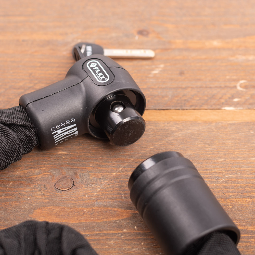 De stevige ketting bestaat uit schakels van gehard staal met een dikte van 11 millimeter. Eventjes doorknippen is er dus niet bij. In gesloten toestand zit het slot ook daadwerkelijk goed vast, dankzij de solide slotkop die ook beschermt tegen vocht en vuil. De cilinder is beveiligd tegen boren.