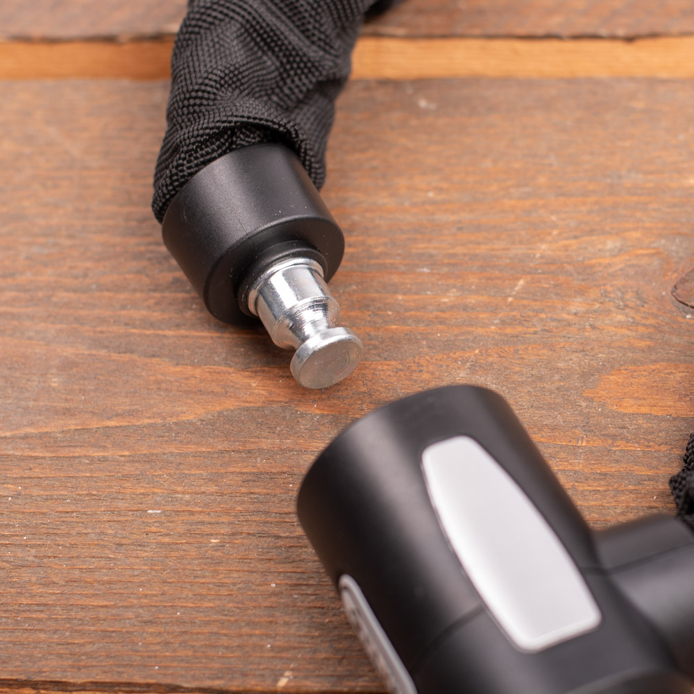 De stevige ketting bestaat uit schakels van gehard staal met een dikte van 8,5 millimeter. Eventjes doorknippen is er dus niet bij. In gesloten toestand zit het slot ook daadwerkelijk goed vast, dankzij de robuuste slotkop. De cilinder is beveiligd tegen boren.