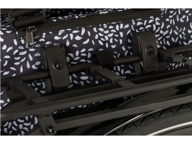 Met de KLICKfix E-bike Variohaken en klittenband aan de achterkant bevestigt u de tas eenvoudig aan de bagagedrager. U kunt de tas ook weer met één beweging van de fiets afhalen. Als er genoeg ruimte is tussen accu en drager, is de tas ook geschikt voor e-bikes.