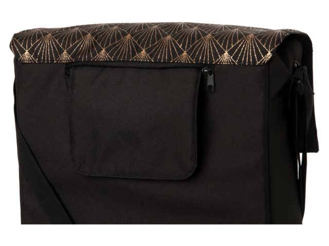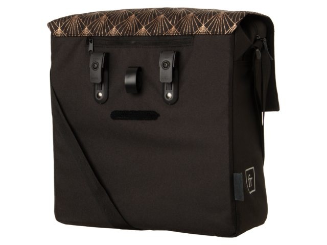 Deze enkele fietstas van FastRider heeft door de klep met een koperkleurig geborduurd patroon en zwarte lederen details een trendy uitstraling. De stevige tas heeft een inhoud van 17 liter, is waterafstotend en voorzien van reflectie voor extra zichtbaarheid in het donker.
