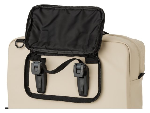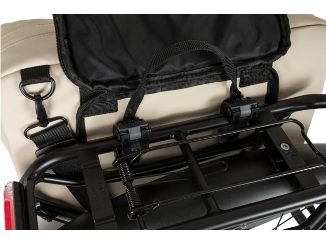Wanneer u te voet verder gaat met de tas, kunt u de haken netjes wegwerken achter een flap met rits. U draagt de tas gemakkelijk met u mee aan de verstelbare, afneembare zwarte schouderband met gespen, of aan de handgrepen bovenaan. Deze kunt u met een bandje met een drukknoop aan elkaar vastmaken voor een prettigere grip.