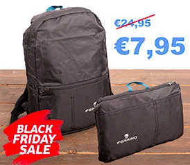 Deze lichtgewicht rugzak van het merk Ferrino heeft een inhoud van 15 liter en is gemaakt van 100% gerecycled PET-polyester. De zwarte tas is voorzien van een extra voorvak en een band voor een trolley. De dagrugzak is opvouwbaar en is daardoor gemakkelijk mee te nemen in de bagage, als extra tas voor onderweg.