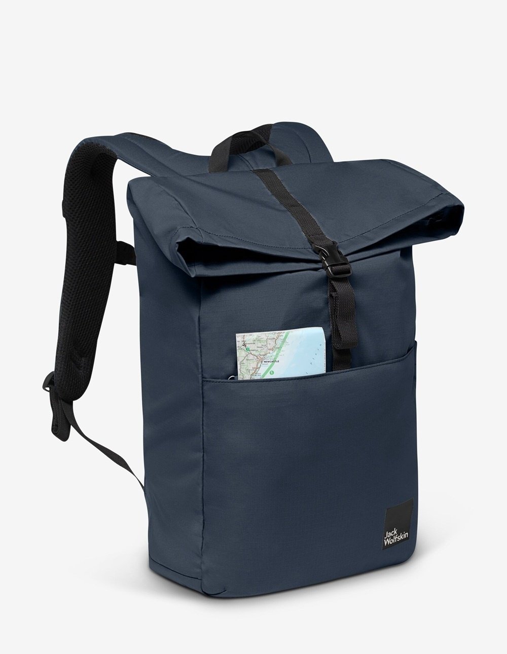 Het ruime hoofdvak van deze rugtas sluit met een rits en een rolltopsluiting die wordt vastgezet met een klikgesp. Achterin het hoofdvak zit een ritsvakje en een gevoerd laptopvak geschikt voor de meeste 15" laptops. Aan de voorkant van de tas zit nog een ritsvak. In het rekbare zijvak kan een drinkfles worden opgeborgen. De stevige tas heeft een gevoerde bodem.