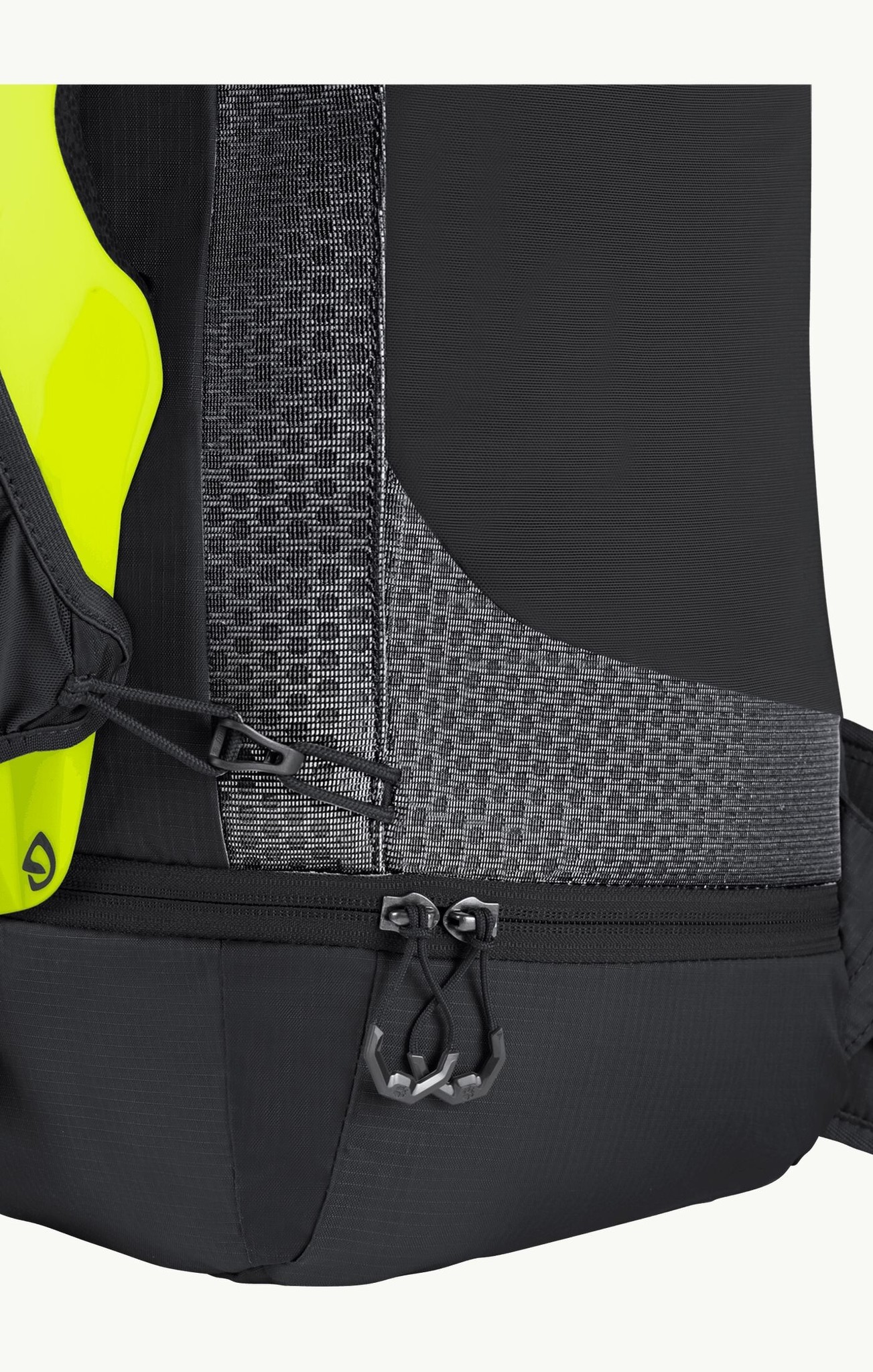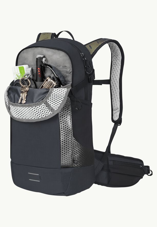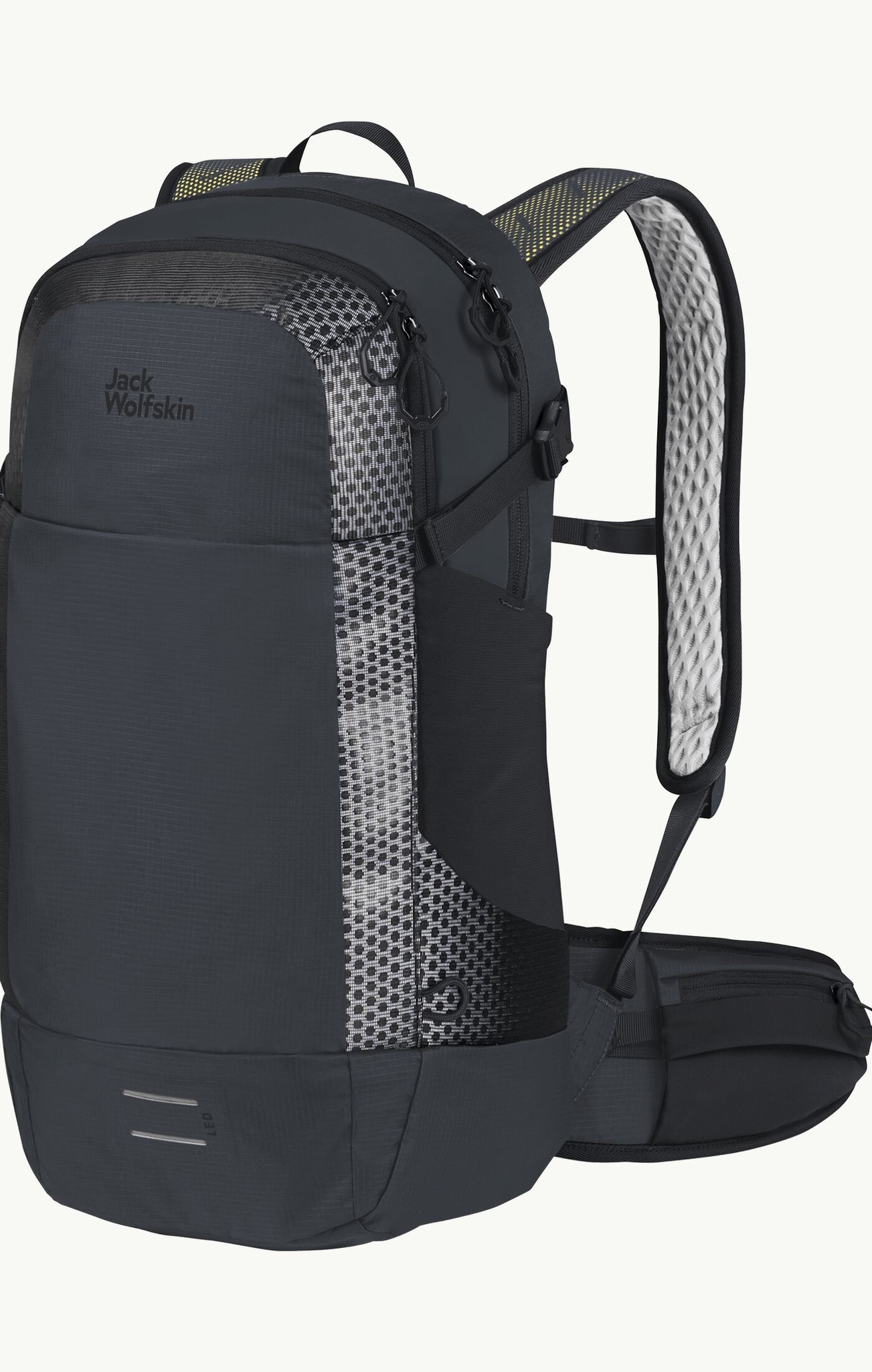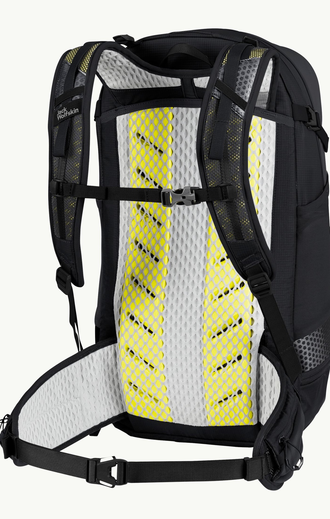 Dankzij het AEROSHAPE-draagsysteem draagt u de rugtas comfortabel op uw rug. Het flexibele fullcontact-draagsysteem van Jack Wolfskin sluit goed aan op uw lichaam en ventileert uitstekend. Deze ventilatie bestaat uit het centrale ventilatiekanaal en luchtdoorlatende rugpaddings, schouderriemen en heupriem met ademende netstof bekleding. Hierdoor wordt uw lichaam onderweg aangenaam gekoeld en heeft u minder snel last van bijvoorbeeld een klamme rug.