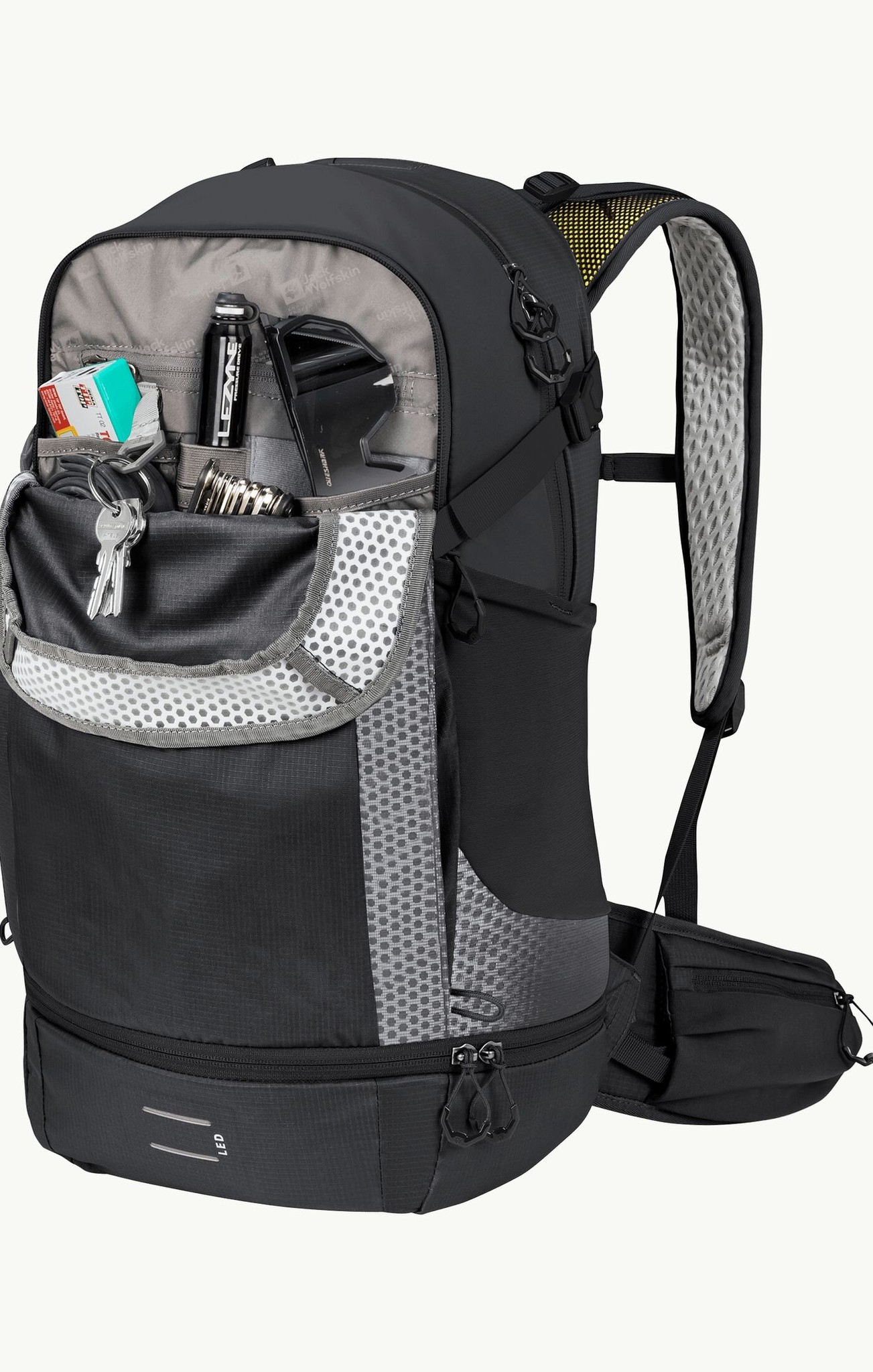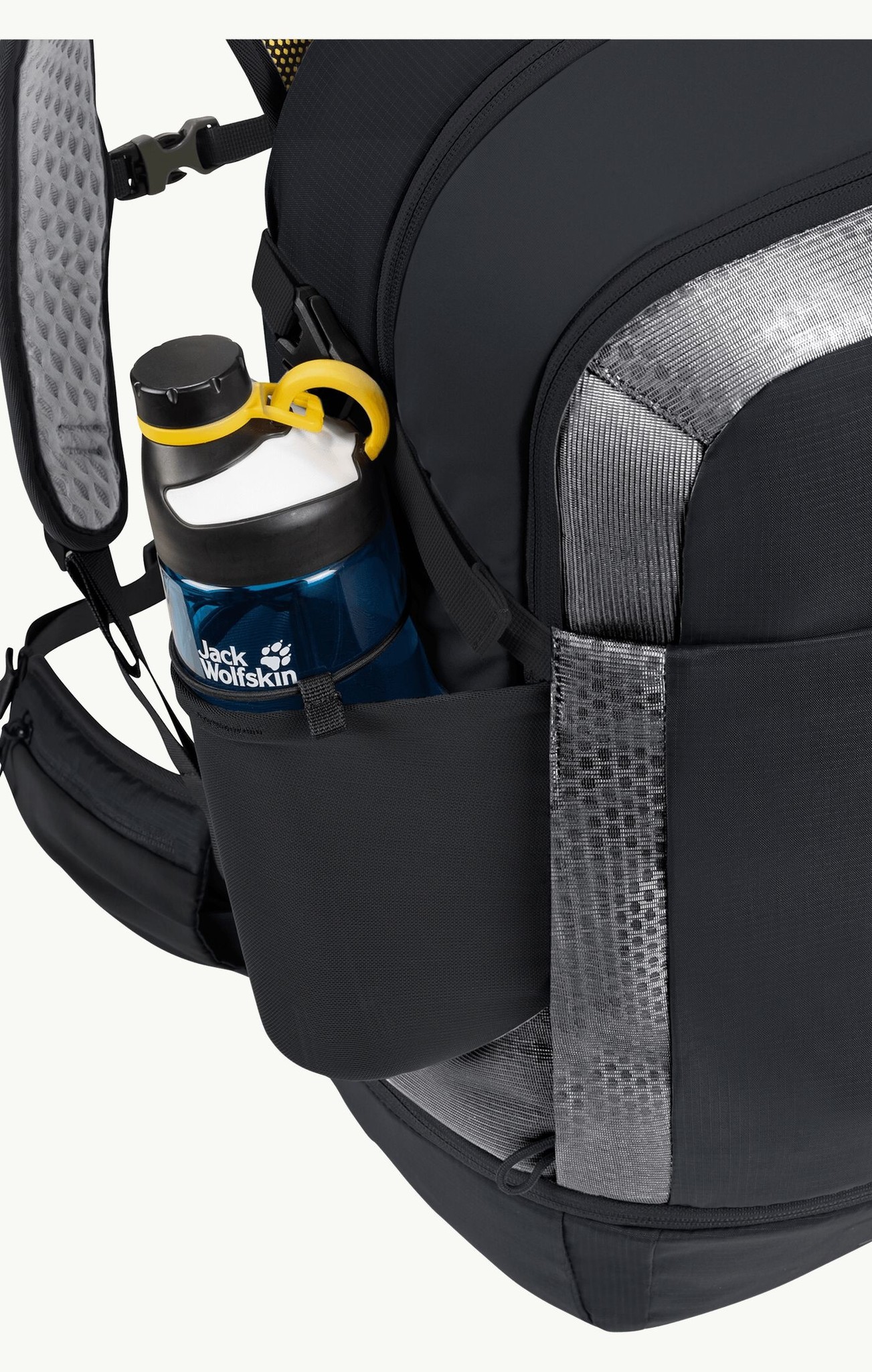 Dankzij het AEROSHAPE-draagsysteem draagt u de rugtas comfortabel op uw rug. Het flexibele fullcontact-draagsysteem van Jack Wolfskin sluit goed aan op uw lichaam en ventileert uitstekend. Deze ventilatie bestaat uit het centrale ventilatiekanaal en luchtdoorlatende rugpaddings, schouderriemen en heupriem met ademende netstof bekleding. Hierdoor wordt uw lichaam onderweg aangenaam gekoeld en heeft u minder snel last van bijvoorbeeld een klamme rug.