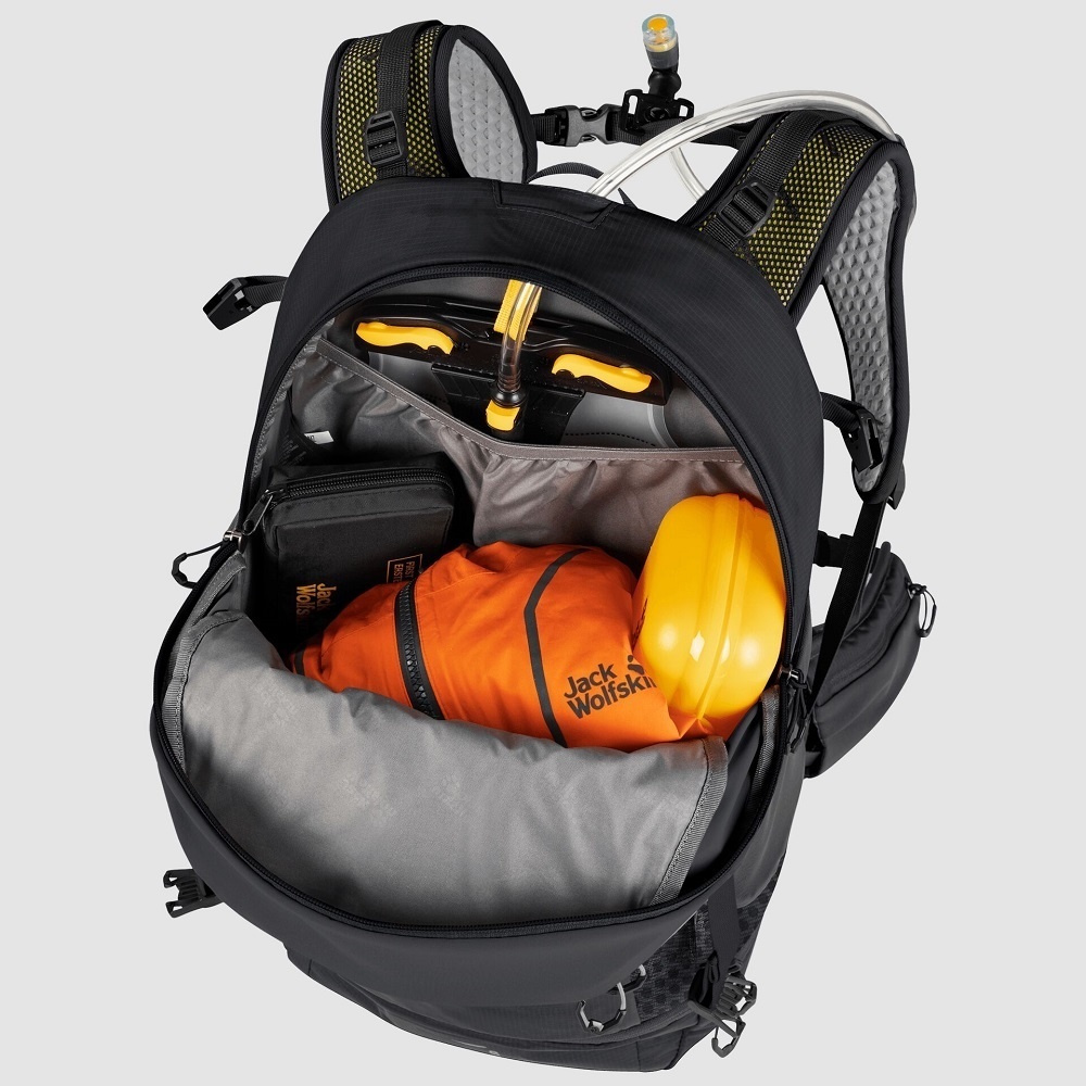 Deze Moab Jam Pro heeft een zeer ruime inhoud van 34,5 liter, verdeeld over verschillende compartimenten. Het ruime hoofdvak heeft een binnenvak waarin een drinksysteem (niet inbegrepen) geplaatst kan worden. Kleinere spullen kunt u opbergen in het voorvak met rits. Hier vindt u een handige organiser inclusief ritsvak, steekvakjes en sleutelhaak, zodat u uw spullen, zoals fietsgereedschap, overzichtelijk kunt opbergen. De tas heeft ook een ruim bodemvak met een brede ritssluiting. Spullen die u voor het grijpen wilt hebben, zoals een energiereep, kunt u kwijt in de elastische ritsvakken op de heupbanden. In het vak voorop de tas kunt u bijvoorbeeld een extra kledingstuk opbergen. In dit vak vindt u ook de geïntegreerde helmhouder. De twee elastische zijvakken zijn ideaal voor een bidon.