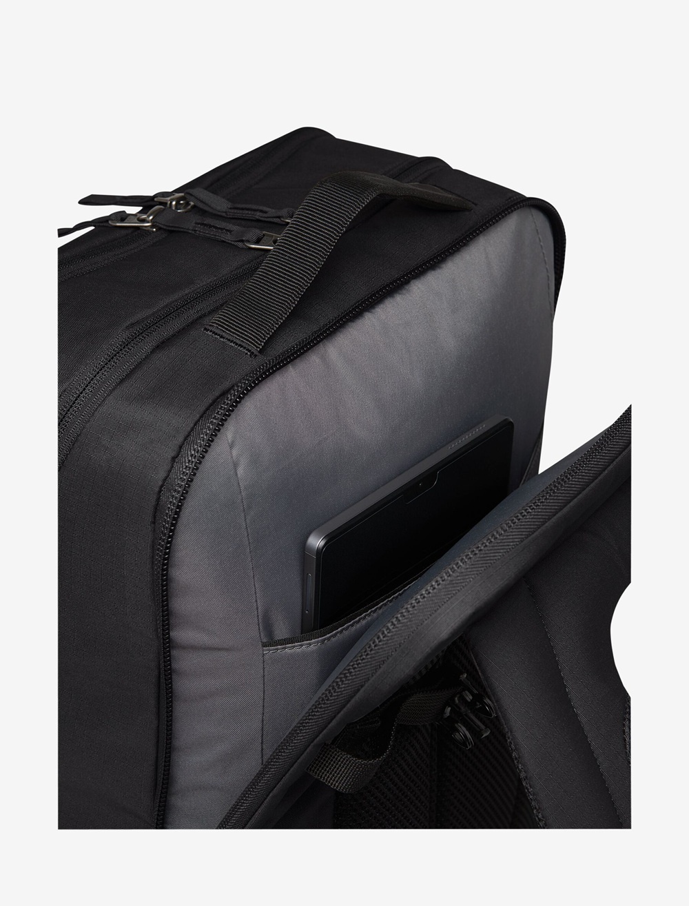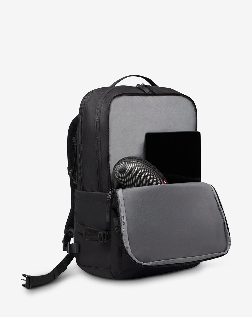 Deze rugtas heeft meerdere ruime ritsvakken. Het middelste vak biedt ruimte voor boeken en paperassen van A4-formaat. Er is ook een mesh ritsvakje voor kleinere spullen. Het grote achterste ritsvak is een gevoerd laptopcompartiment, geschikt voor de meeste 15" laptops. In dit compartiment zit ook een gevoerd steekvak waar een tablet (10") in past. In de rekbare zijvakken kan een drinkfles worden opgeborgen, en op de voorkant zitten bevestigingslussen. De stevige tas heeft een gevoerde bodem en een verstevigd rugpaneel.