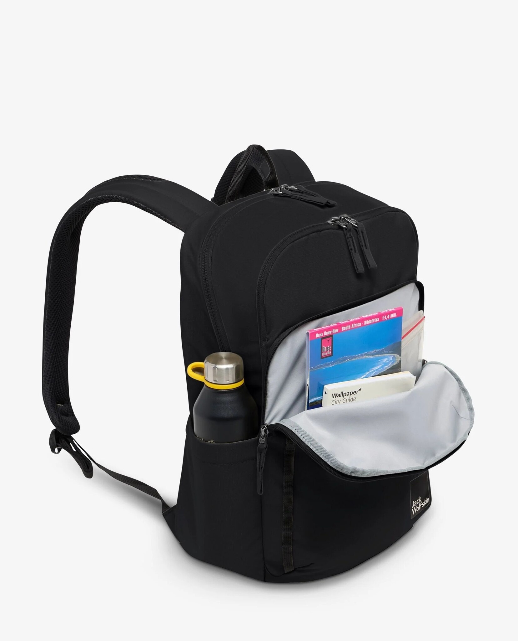 Het achterste vak van deze rugtas biedt ruimte voor boeken en paperassen van A4-formaat. Achterin dit vak zitten een gevoerd laptopvak en twee steekvakken. Ook het grote ritsvak daarvoor biedt veel opbergruimte voor allerlei spullen. En dan is er nog een wat kleiner ritsvak op de voorkant van de tas. In het rekbare zijvak kan een drinkfles worden opgeborgen, en op de voorkant zitten bevestigingslussen. De stevige tas heeft een gevoerde bodem.