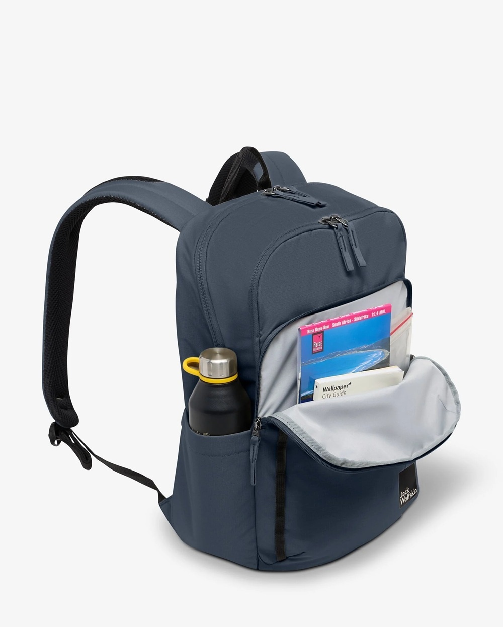 Het achterste vak van deze rugtas biedt ruimte voor boeken en paperassen van A4-formaat. Achterin dit vak zitten een gevoerd laptopvak en twee steekvakken. Ook het grote ritsvak daarvoor biedt veel opbergruimte voor allerlei spullen. En dan is er nog een wat kleiner ritsvak op de voorkant van de tas. In het rekbare zijvak kan een drinkfles worden opgeborgen, en op de voorkant zitten zwarte bevestigingslussen. De stevige tas heeft een gevoerde bodem.