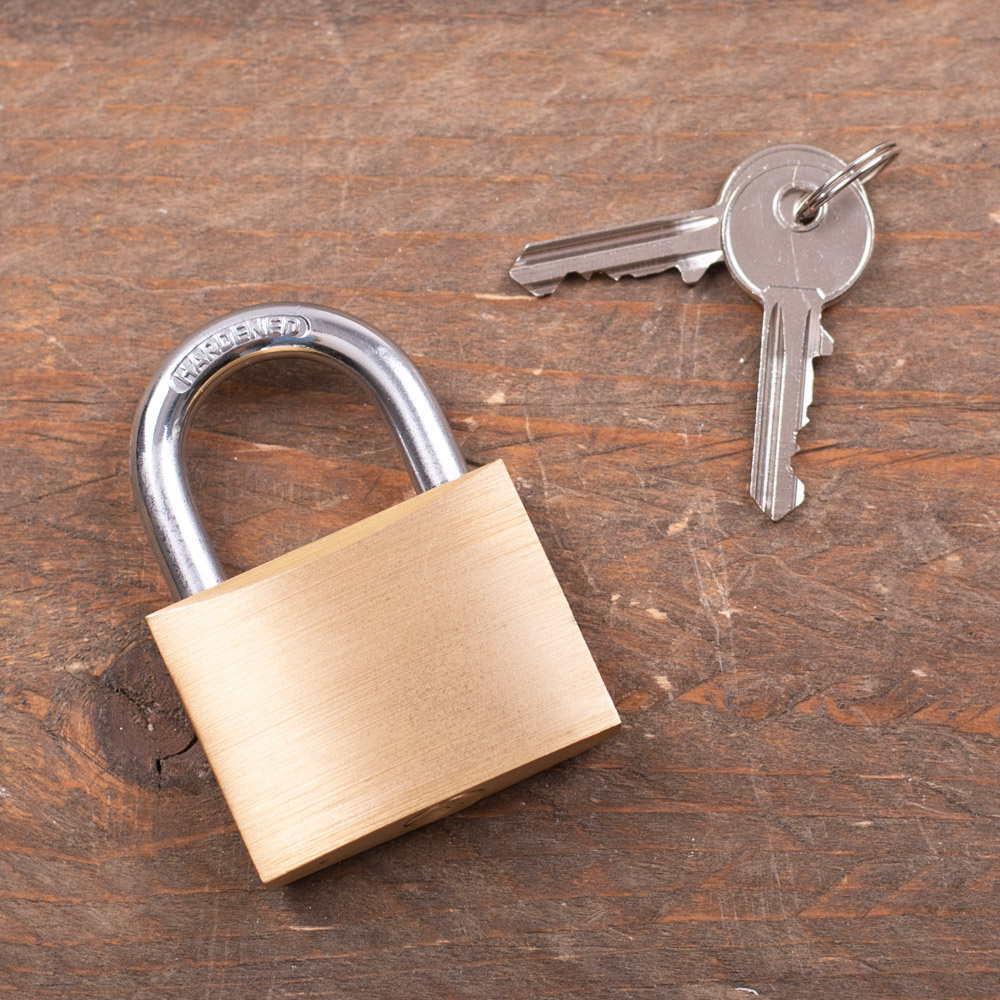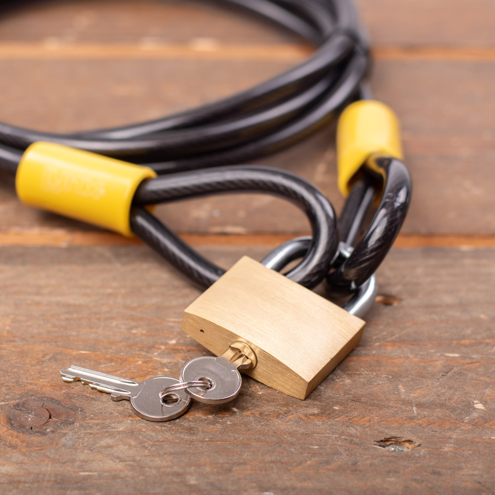 De kabel wordt vastgezet met het bijgeleverde messing hangslot en de bijbehorende twee sleutels.