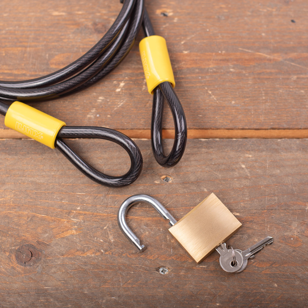 De kabel wordt vastgezet met het bijgeleverde messing hangslot en de bijbehorende twee sleutels. Dit fietsslot is uitgevoerd met een 'smoky' zwarte beschermlaag rond de kabel zodat er niets wordt beschadigd bij gebruik van het slot. Het gewicht van dit Lynx kabelslot is 0,64 kg.