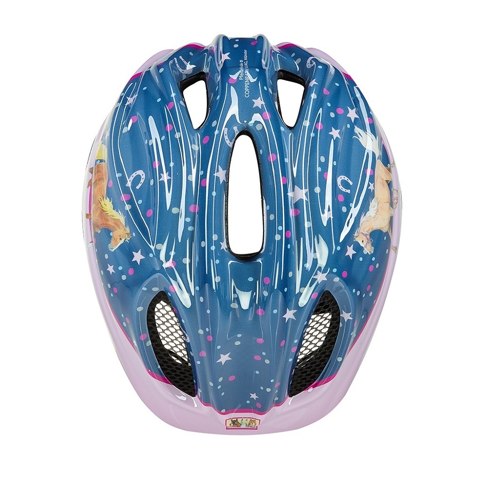 Deze donkerblauwe en paarse helm heeft een opdruk van paarden, stippen, sterren en hoefijzers. De helm is licht van gewicht en doet zijn beschermende werking uitstekend. De kinderfietshelm draagt comfortabel en is heel precies op het hoofd van uw kindje af te stellen. Zo zit de helm altijd als gegoten en biedt deze een zo optimaal mogelijke bescherming. Achterop de helm bevindt zich een dubbel led knipperlicht, voor extra zichtbaarheid in het verkeer.
