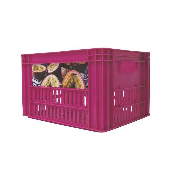 De eerste foto op deze pagina toont u een voorbeeld van een violet krat met de sticker 'Passievrucht' (let op: het krat dient u los te bestellen!)