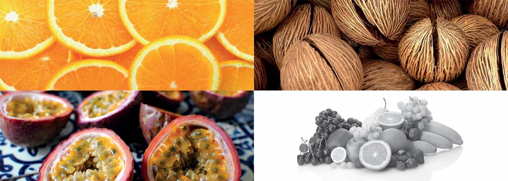 De vierde foto toont de stickers 'Sinaasappels', 'Kokosnoten', 'Passievruchten' en 'Fruit (zwart-wit)'