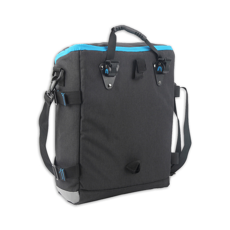 U pakt de tas eenvoudig in één beweging van de fiets af. Even trekken aan het handvat dat gekoppeld is aan het kliksysteem, en de haken klikken soepel los van de bagagedrager. Wilt u de tas te voet meenemen? Dat kan met de bijgeleverde afneembare en verstelbare schouderband.