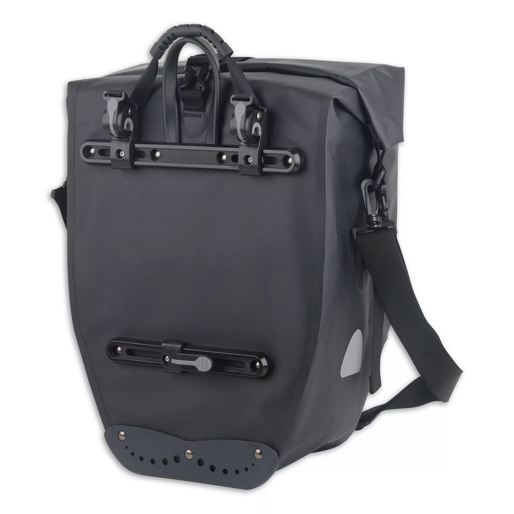 U pakt de tas eenvoudig in één beweging van de fiets af. Even trekken aan het handvat dat gekoppeld is aan het kliksysteem, en de haken klikken soepel los van de bagagedrager. Wilt u de tas te voet meenemen? Dat kan met de bijgeleverde afneembare en verstelbare schouderband.