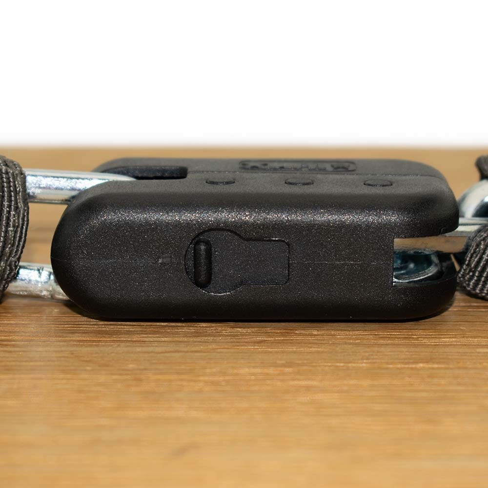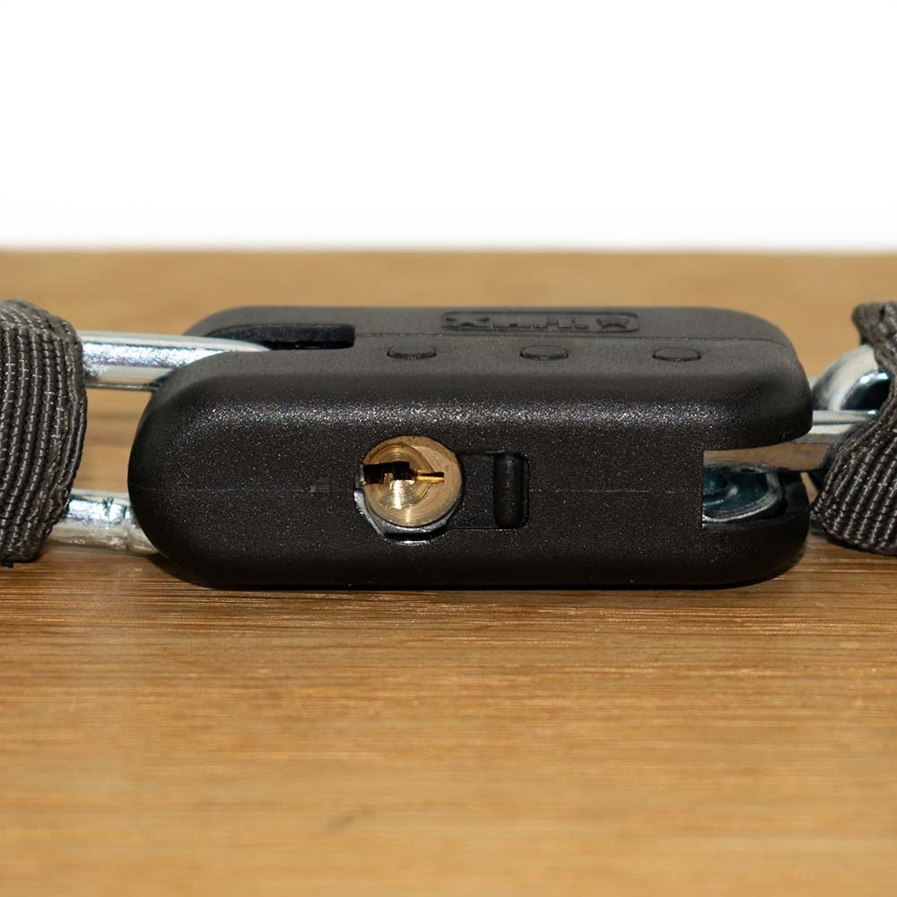 De stevige ketting bestaat uit gehard staal van 6,3 millimeter dik. Eventjes doorknippen is er dus niet bij. In gesloten toestand zit het slot ook daadwerkelijk goed vast, dankzij de vaste kop met solide pinsluiting.