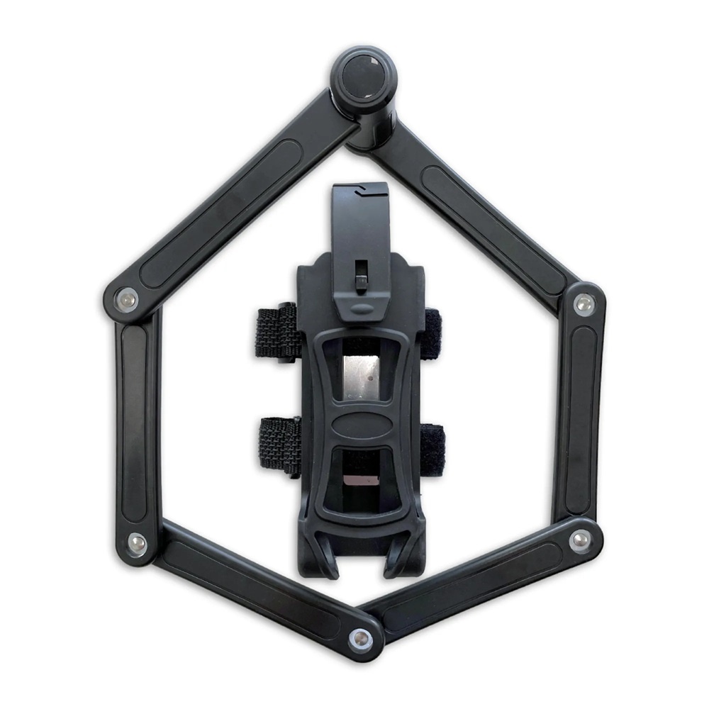 Het vouwslot wordt geleverd met twee sleutels en een handige houder voor aan het fietsframe, om het slot gemakkelijk te kunnen meenemen. De houder wordt aan het frame bevestigd met twee krachtige klittenband straps.