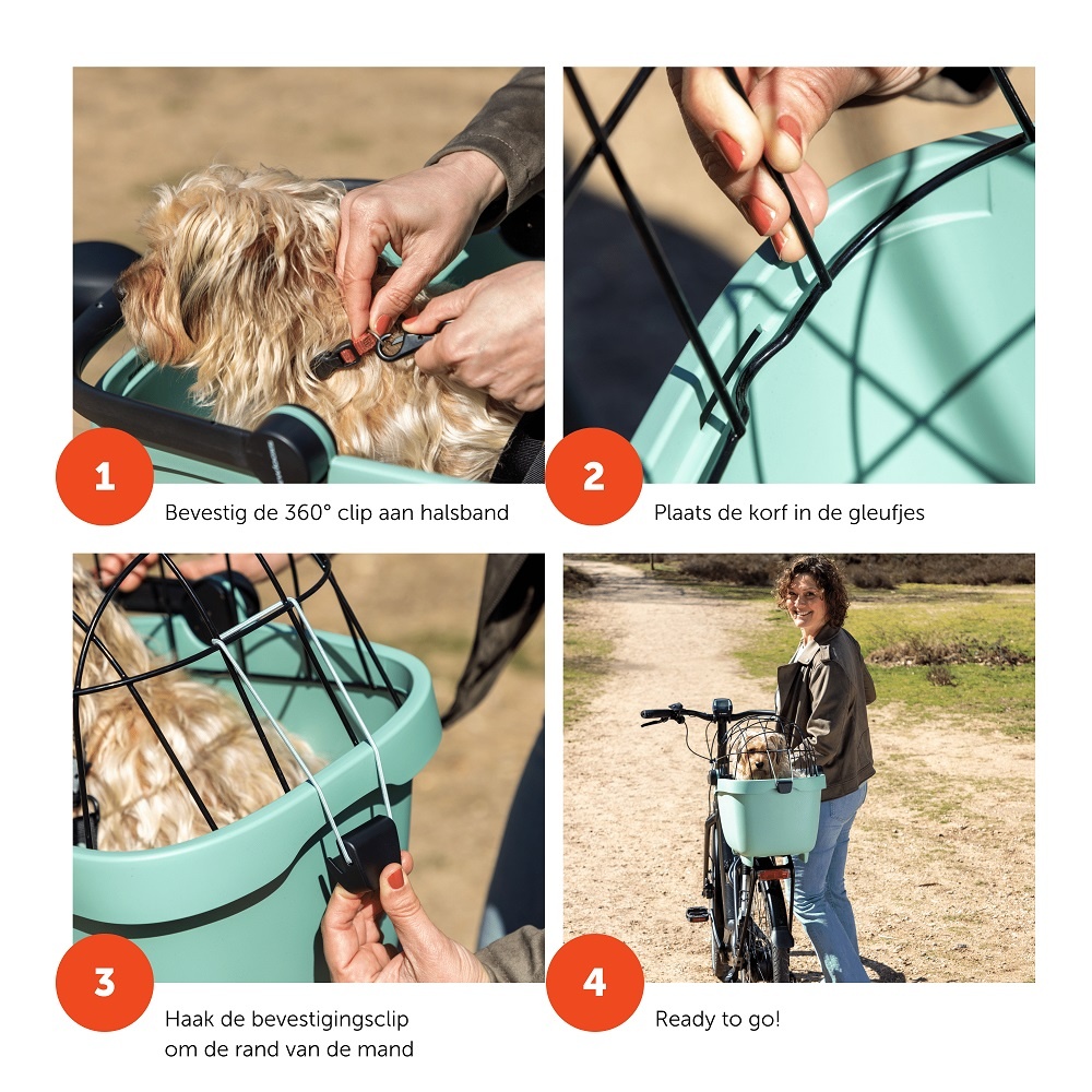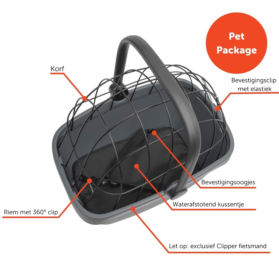 Met de Clipper Pet Package tovert u fietsmand Clipper van New Looxs heel gemakkelijk om tot een hondenfietsmand. De set bestaat onder meer uit een korf, een riempje en een zacht waterafstotend kussentje. Dankzij de draadkoepel kan uw hond niet onverwacht uit de mand springen. Zo kunt u uw trouwe viervoeter veilig en comfortabel op de fiets vervoeren!