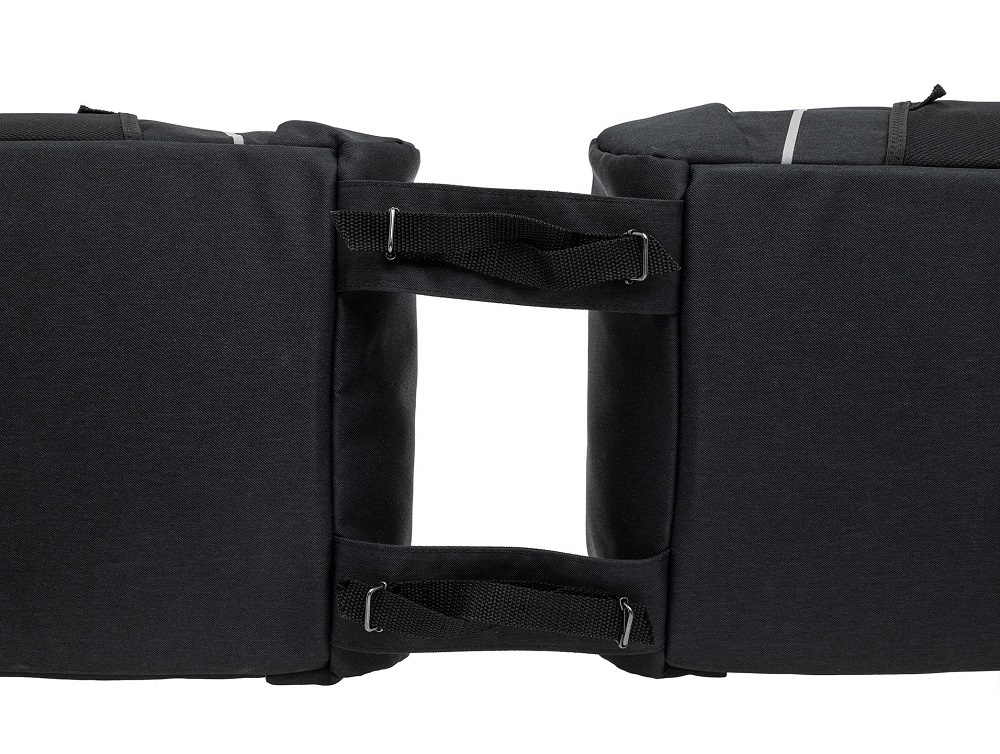 U maakt deze dubbele fietstas makkelijk vast aan uw bagagedrager met de verstelbare riempjes. Voor extra stevigheid kunt u de tas vastzetten met de klittenband stroken.