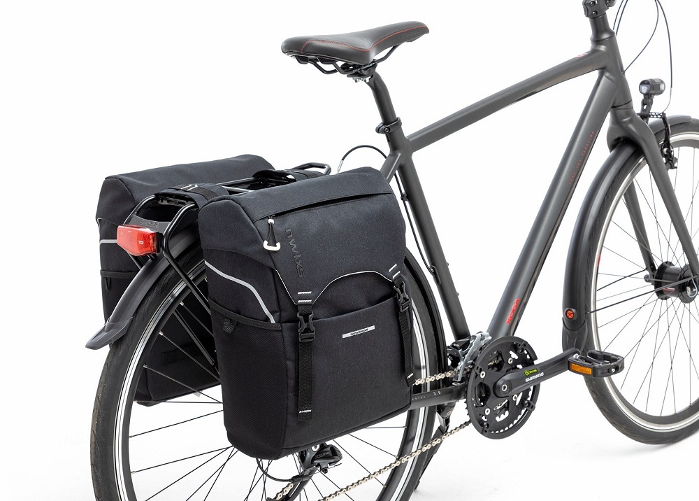 Uit de New Looxs Sports-serie: een praktische en sportieve tas voor achterop de fiets. Deze zwarte dubbele fietstas is gemaakt van waterafstotend polyester en voorzien van reflectie en een regenhoes.
