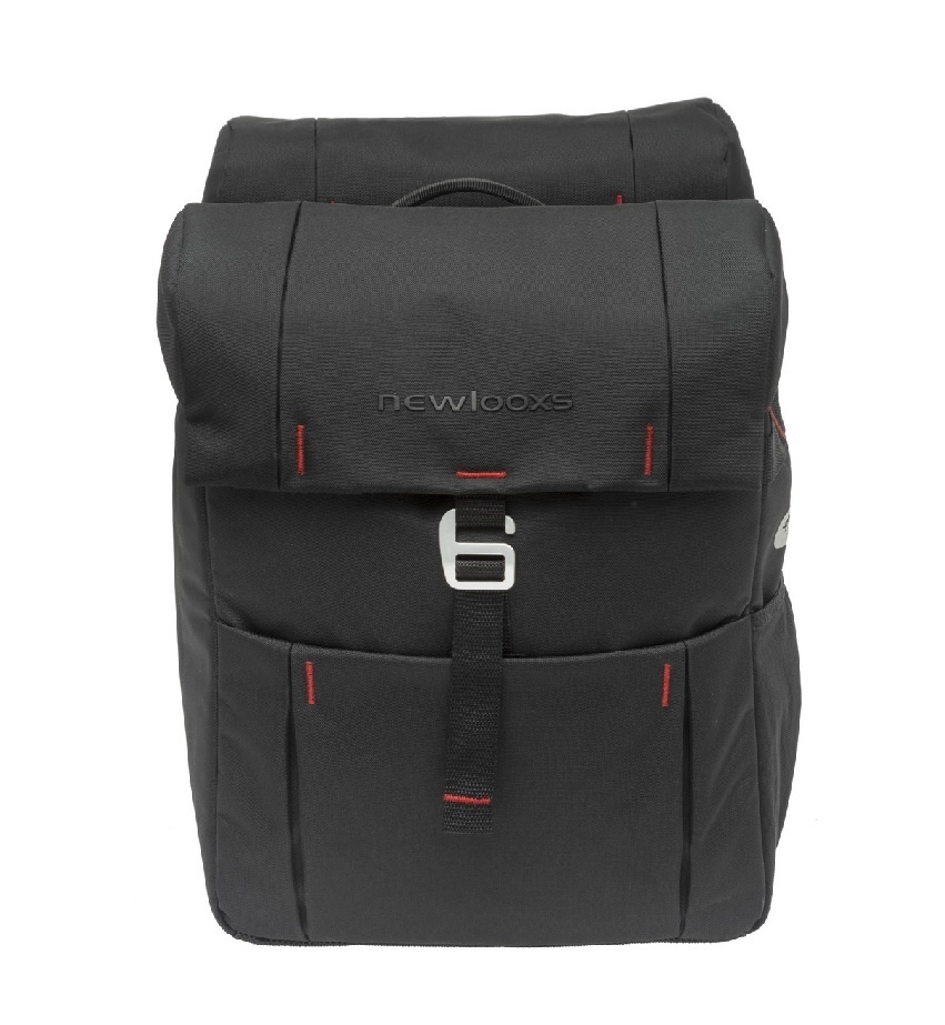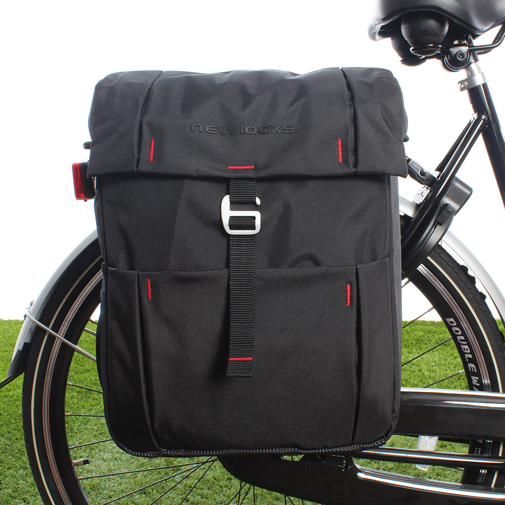 Deze dubbele fietstas heeft ruime hoofdvakken die u op twee manieren kunt afsluiten. Ten eerste sluit u de tas met een koord dat u kunt aansnoeren. Daarna sluit u de tas met de flap die u met een haak op verschillende standen kunt vast zetten. De tassen zijn voorzien van een verharde bodemplaat en hebben beide een extra voorvak en twee extra zijvakken. De tas is waterafstotend. Wanneer de tas echt 100% waterdicht moet zijn, kunt u de New Looxs-regenhoes bijbestellen.