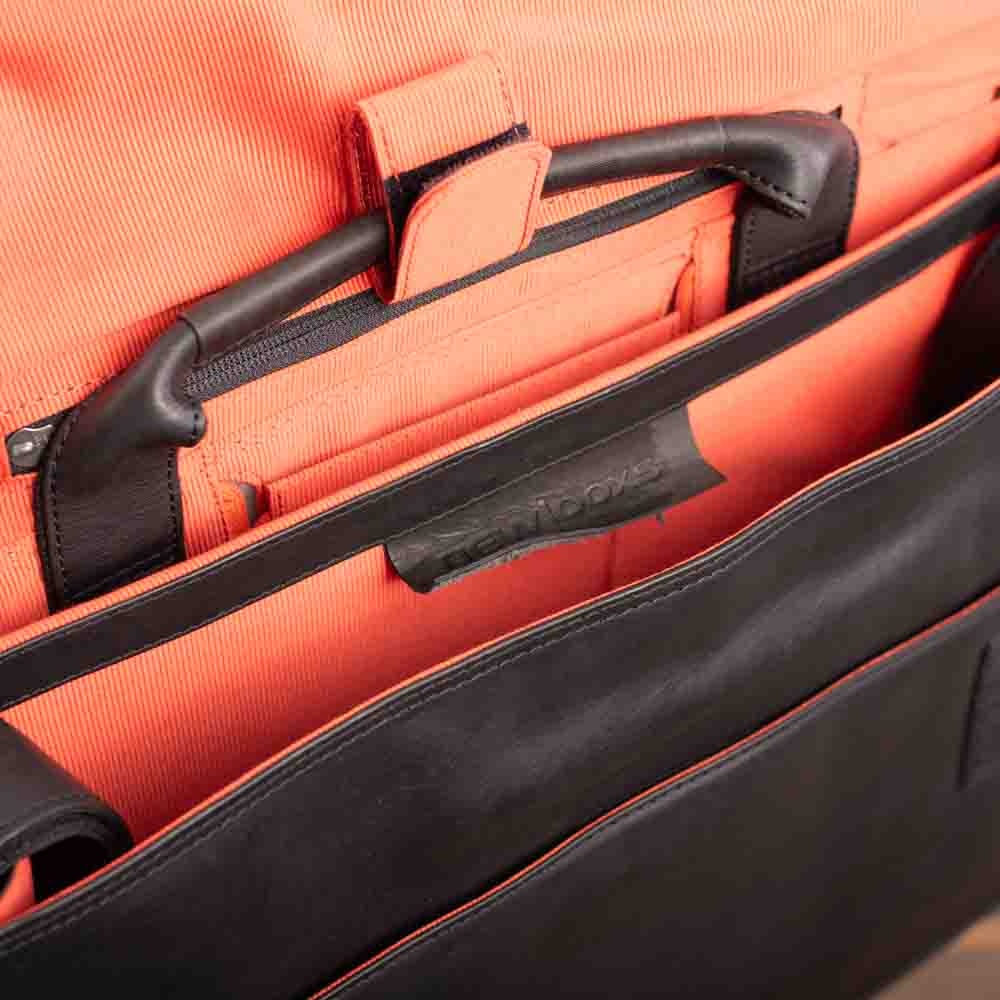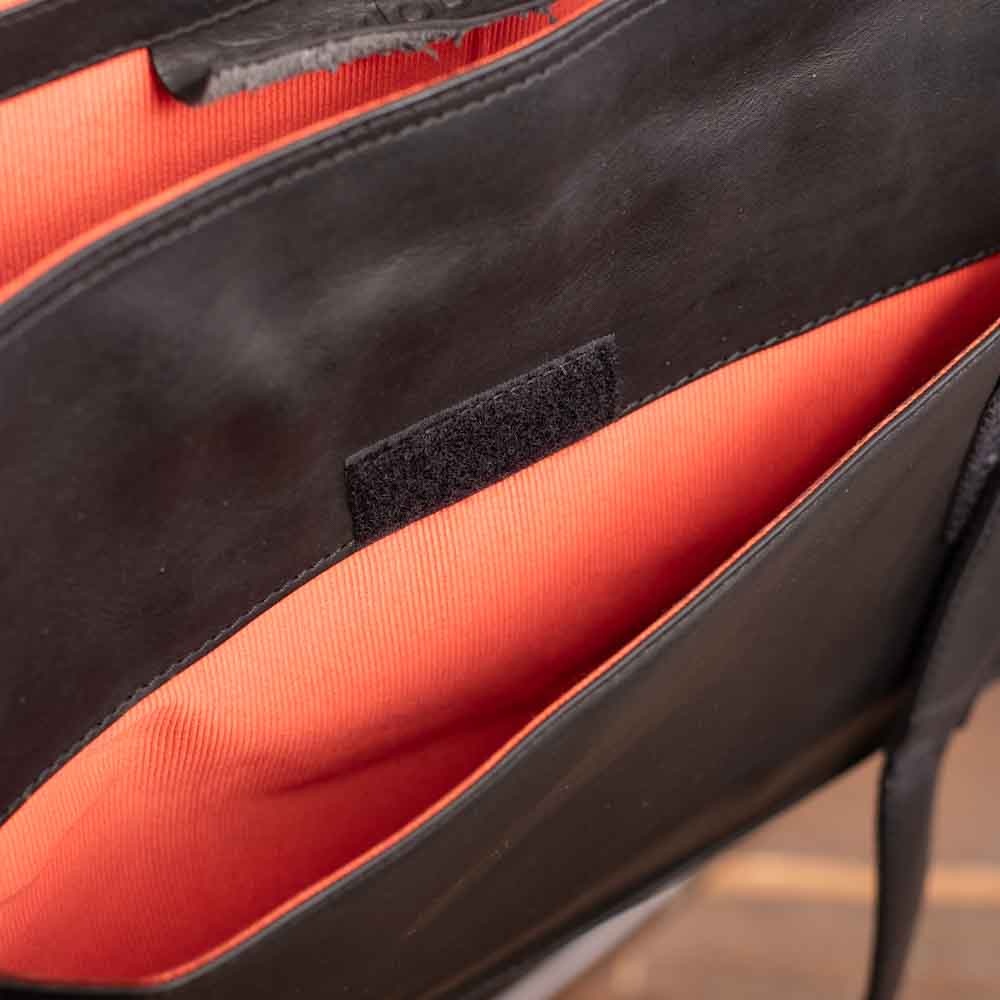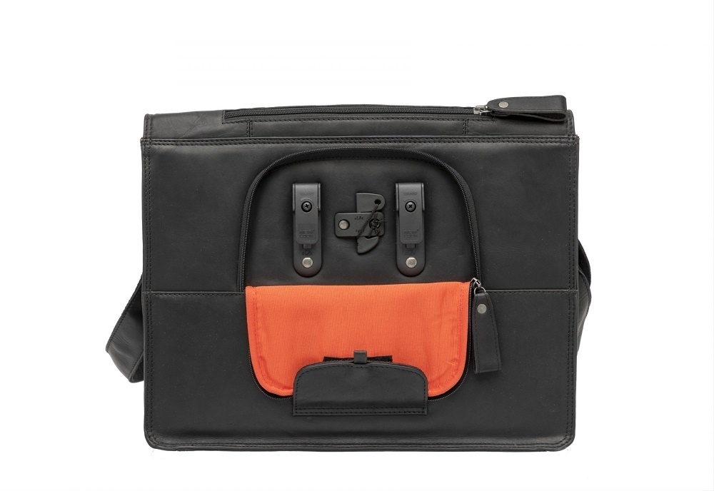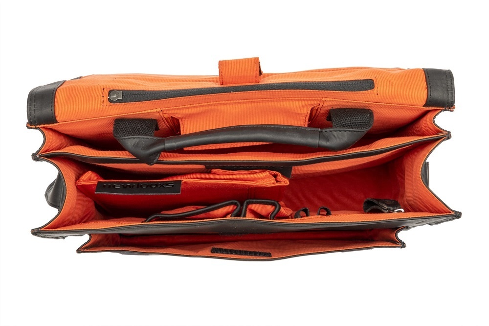 De zwarte enkele fietstas beschikt over ruime vakken met daarin verschillende kleinere vakken en penhouders. Daar overheen gaat een klep die sluit met klittenband. Binnenin de tas vindt u een gevoerd vak voor een 15 inch laptop (38 cm breed) en een uitneembare hoes voor een tablet. Aan de voorzijde van de tas is nog een ruim opbergvak dat sluit met klittenband. De tas heeft een opvallende oranje binnenvoering.