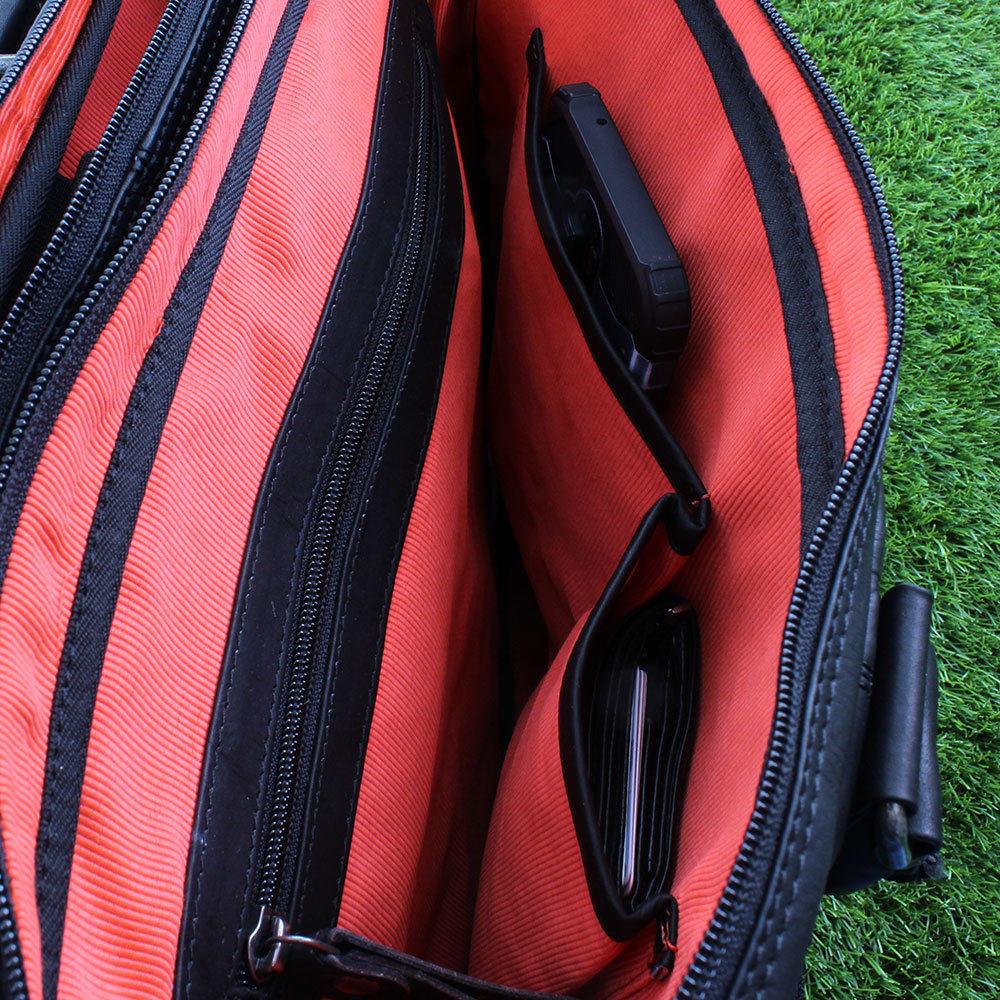 Deze zwarte enkele fietstas is aan de binnenkant bekleed met een fijne oranje ribstof, wat de tas een retro uitstraling geeft. Met dezelfde kleur oranje is een New Looxs logo aan de voorkant van de tas vast gestikt. De tas bestaat uit twee ruime hoofdvakken, beide af te sluiten met rits. In het ene hoofdvak vindt u een gepolsterd insteekvak voor uw 15" notebook, welke u kunt afsluiten met klittenband. Ook vindt u hier een hoes voor een 8,9" tablet (zie de foto onderaan de tekst). Het andere hoofdvak heeft twee open opbergvakken en een opbergvak met rits.