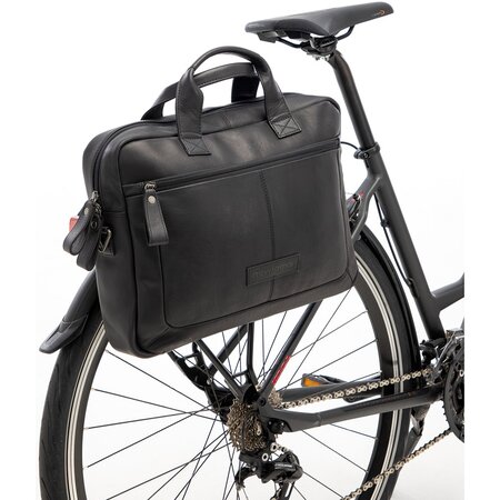De zwarte enkele fietstas heeft een hoofdvak met daarin een gevoerd laptopvak en een organiser met diverse steekvakjes, een ritsvak en vakjes voor pasjes en pennen. De tas sluit met een rits. Het laptopcompartiment biedt ruimte voor een 15 inch laptop en er is een losse hoes voor een tablet. Voorop de tas zit nog een ruim ritsvak.