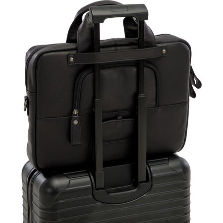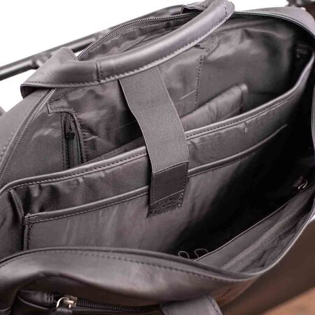 U draagt de luxe pakaftas gemakkelijk met u mee aan de stevige handvatten. Bij de tas zit ook een afneembare en verstelbare leren schouderband, waarmee u de tas kunt dragen als schoudertas. En dankzij de trolleyband aan de achterkant is de tas ook ideaal voor zakenreizen.
