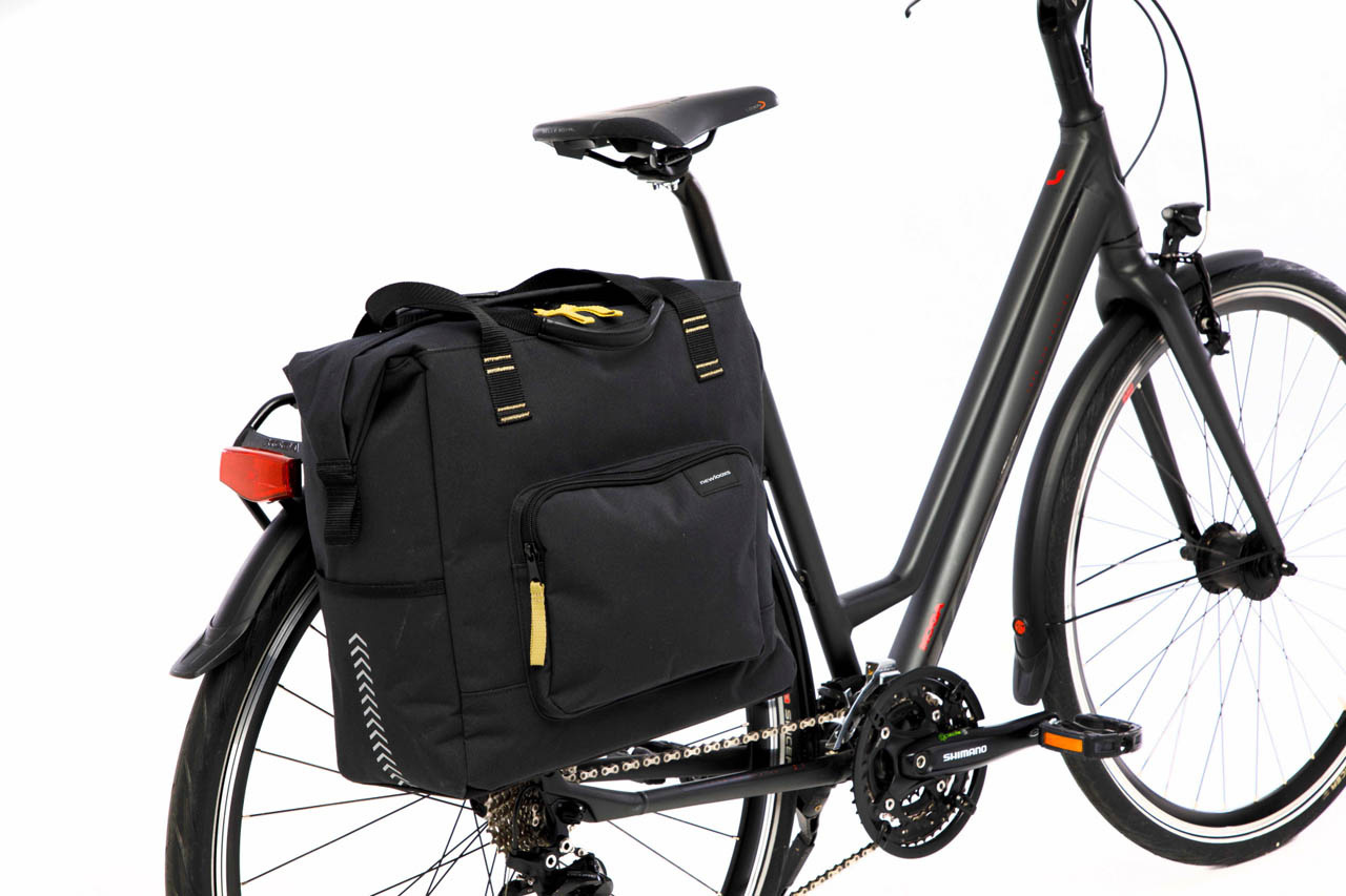 De tas is aan de drager van de fiets te bevestigen met kunststof haken, en u haalt 'm er net zo makkelijk weer vanaf. De haken zijn gebogen en niet verstelbaar. Wanneer u te voet verder gaat, kunt u de haken van de tas afdekken achter een flap met een rits. Vervolgens draagt u de tas gemakkelijk met u mee dankzij de twee hengsels. Handig voor het doen van boodschappen! De tas kan ook op een voordrager geplaatst worden. U bevestigt de tas in dat geval met het klittenband aan de achterzijde van de tas.