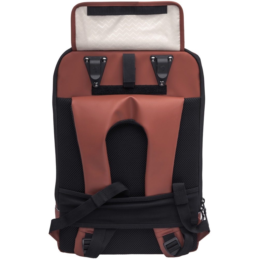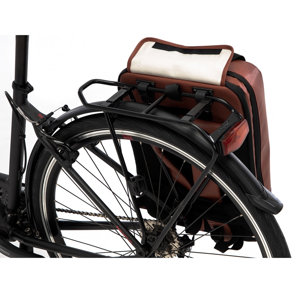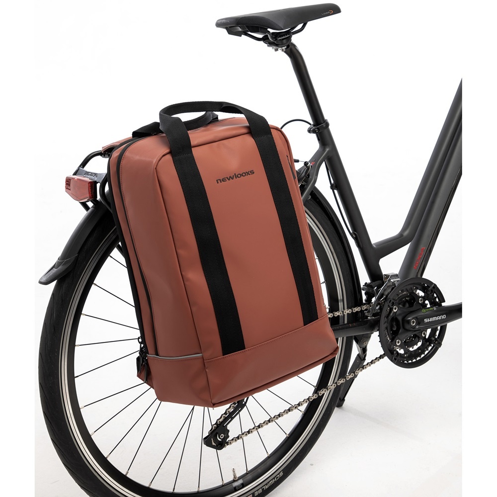 De Nevada van het merk New Looxs is een enkele fietstas en rugtas ineen. Ideaal wanneer u naast uw fietsrit ook een stukje moet wandelen of met het openbaar vervoer verder reist. De roestkleurige tas heeft een inhoud van ca. 20 liter en is gemaakt van waterafstotend polyester met een TPU-coating. De fietsrugzak is voorzien van een tablet- en laptopvak, extra binnenvakken en een oranje regenhoes.