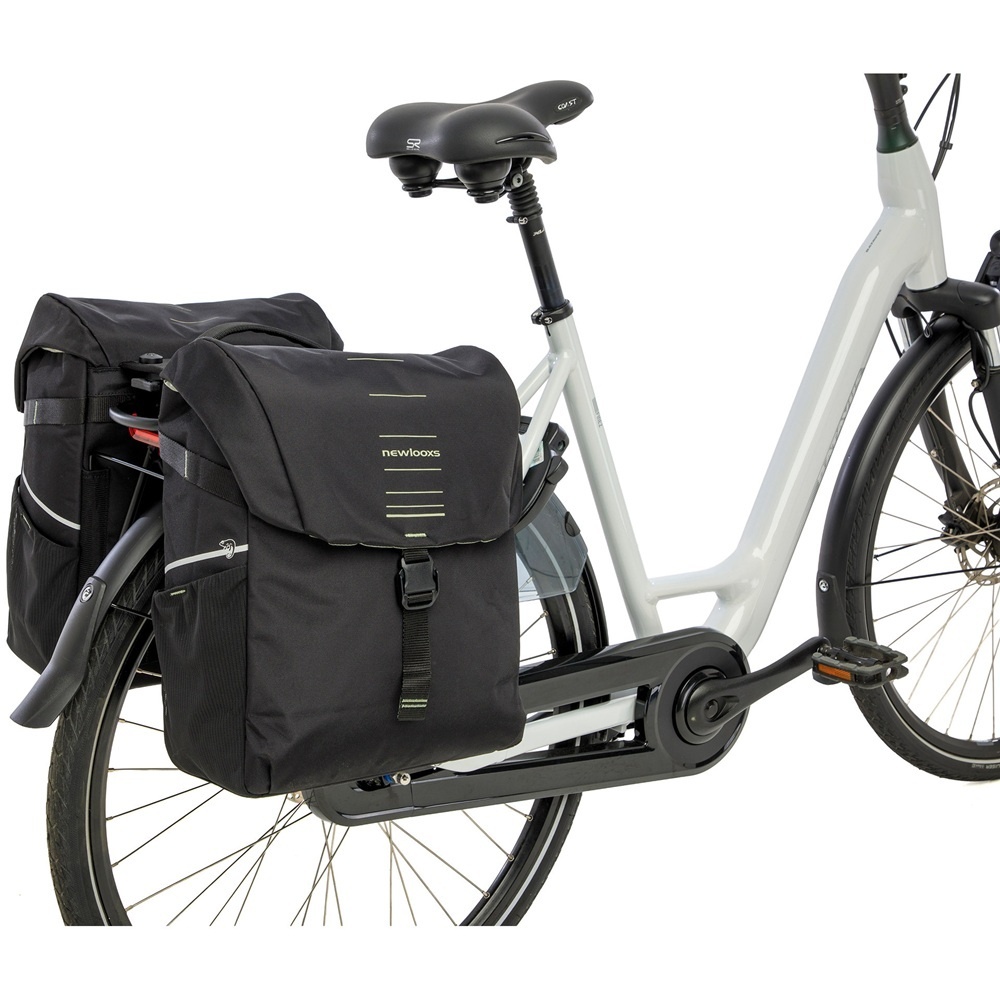 De Vigo Double van het merk New Looxs oogt sportief en biedt ruimte voor 37 liter aan spullen. De tas is gemaakt van waterafstotend polyester en is uitgevoerd in het zwart met lichtgroene accenten en een grijsgroene binnenvoering. De dubbele fietstas is voorzien van reflectie, extra opbergvakken en een voorgemonteerde Snapit 2.0-adapterplaat.