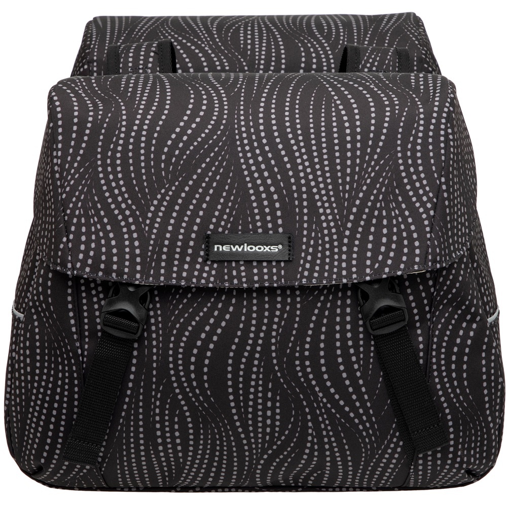 New Looxs is en blijft eigentijds, ook weer met deze zwarte dubbele fietstas Joli Double Alma, met een grijs stippenpatroon. Een waterafstotende boodschappentas met een inhoud van 37 liter, met één extra ritsvak en een snelsluiting met klikgespen.
