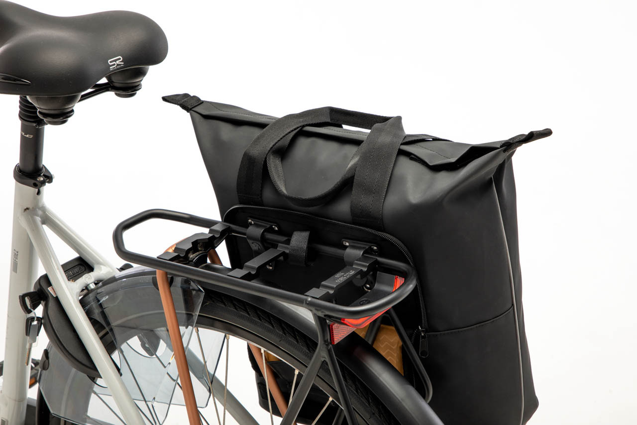 U bevestigt deze fietstas met twee kunststof New Looxs-haken en klittenband aan uw bagagedrager. Het voordeel van deze haken is dat u de tas snel op de fiets zet en hem er net zo makkelijk weer vanaf haalt. De haken zijn gebogen en niet verstelbaar. Wanneer u te voet verder gaat, kunt u de haken van de tas afdekken achter een flap met een rits. Dankzij de brede zwarte nylon handvaten draagt de tas comfortabel.