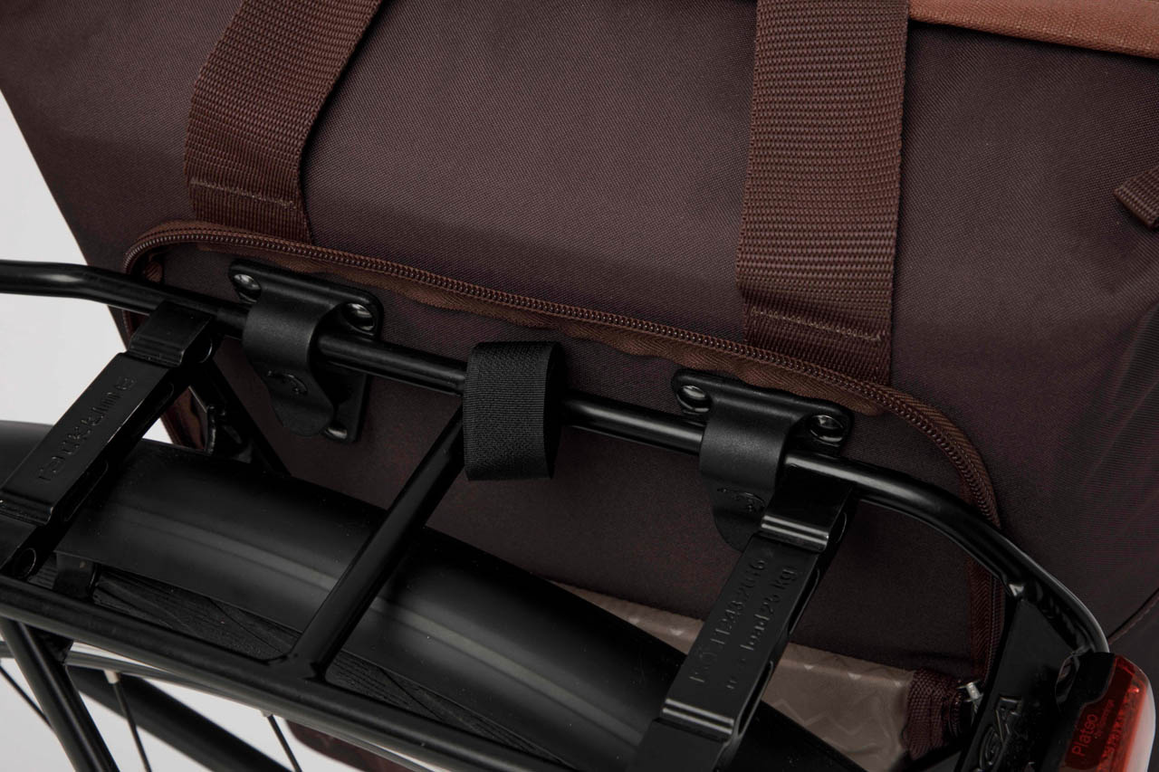 U bevestigt de fietstas met twee kunststof New Looxs-haken en klittenband aan uw bagagedrager. Het voordeel van deze haken is dat u de tas snel op de fiets zet en hem er net zo makkelijk weer vanaf haalt. De haken zijn gebogen en niet verstelbaar. Wanneer u te voet verder gaat, kunt u de haken van de tas afdekken achter een flap met een rits. Dankzij de brede nylon handvaten draagt de tas comfortabel.