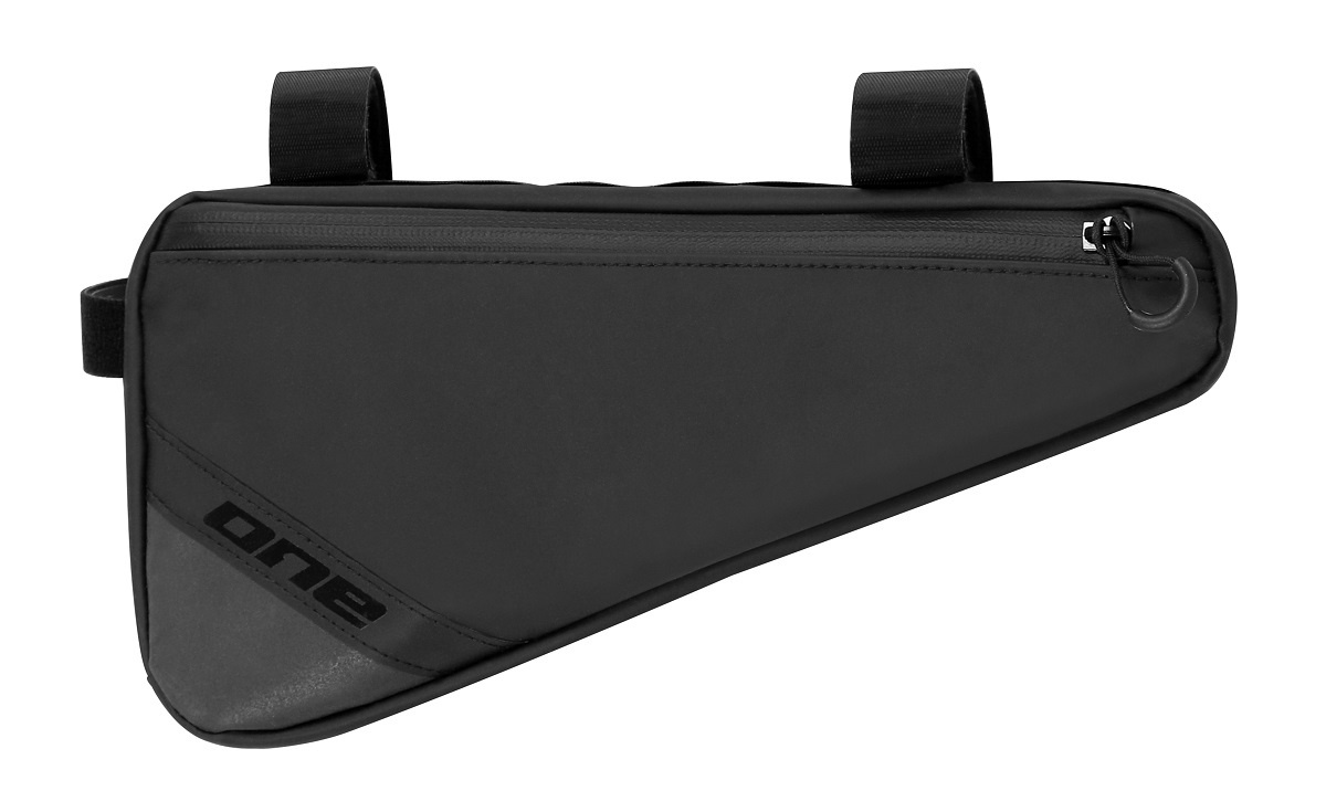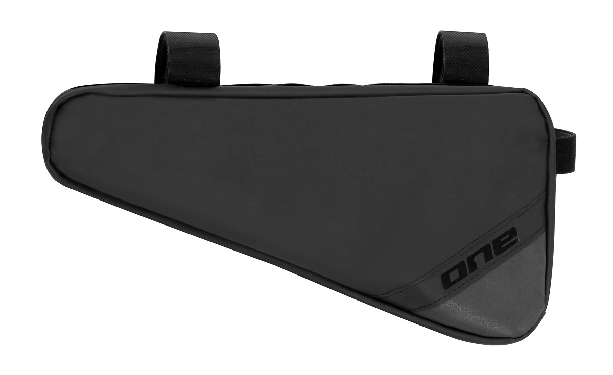 Deze zwarte, waterbestendige frametas 30 van het merk ONE Bikeparts heeft een inhoud van 850 milliliter en is voorzien van reflectie.