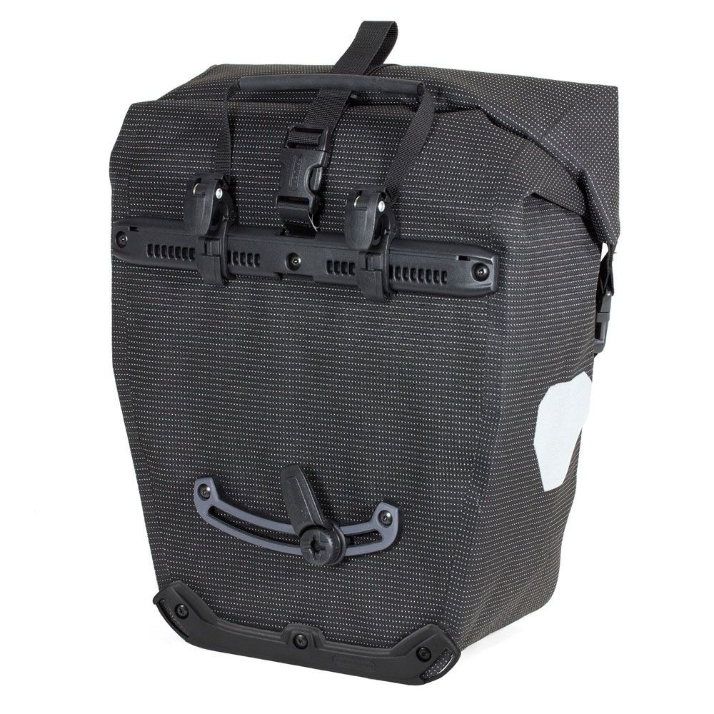 Deze stijlvolle Back-Roller fietstas is onderdeel van de High Visibility-serie van het Duitse kwaliteitsmerk Ortlieb. De fietstas is oersterk, waterdicht en heeft een inhoud van 20 liter. Het materiaal van de tas is volledig doorgestikt met een reflecterend garen. Dit zorgt voor optimale zichtbaarheid in het donker. De tas sluit door middel van een rolsluiting en is dankzij de afneembare schouderband ook handig los van de fiets mee te nemen. U bevestigt de tas eenvoudig aan de fiets middels het Quick Lock 2.1-bevestigingssysteem.