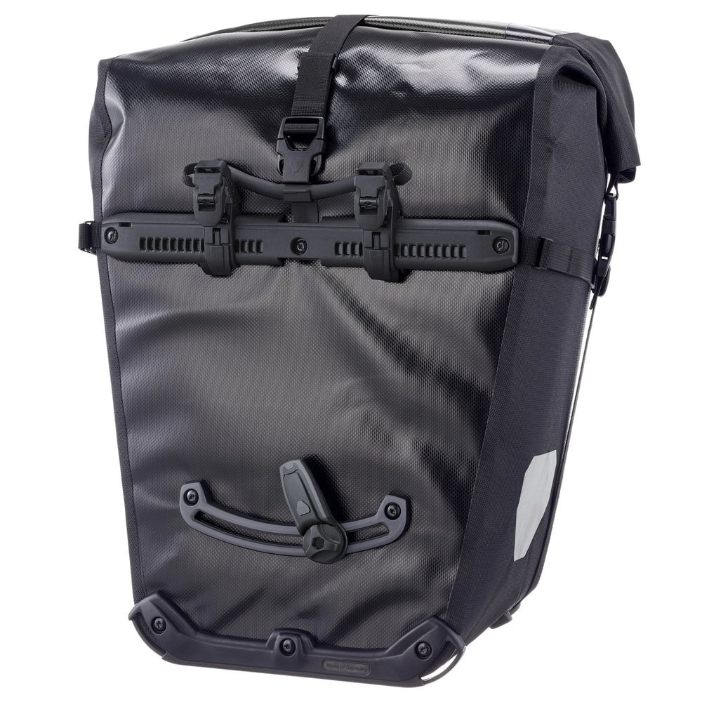 Een set oersterke enkele fietstassen van het Duitse kwaliteitsmerk Ortlieb. De Back Roller XL-tassen bieden samen ruimte voor maar liefst 70 liter (en een beetje) aan spullen. De tassen van waterdicht, slijtvast zeildoekmateriaal zijn uitgevoerd in donkergrijs ('asphalt') en zwart, en zijn voorzien van een waterbestendige rolsluiting, reflectie en Quick Lock 2.2 bevestigingshaken. Kortom: ruime, praktische tassen voor wie op fietsvakantie gaat en veel spullen meeneemt.