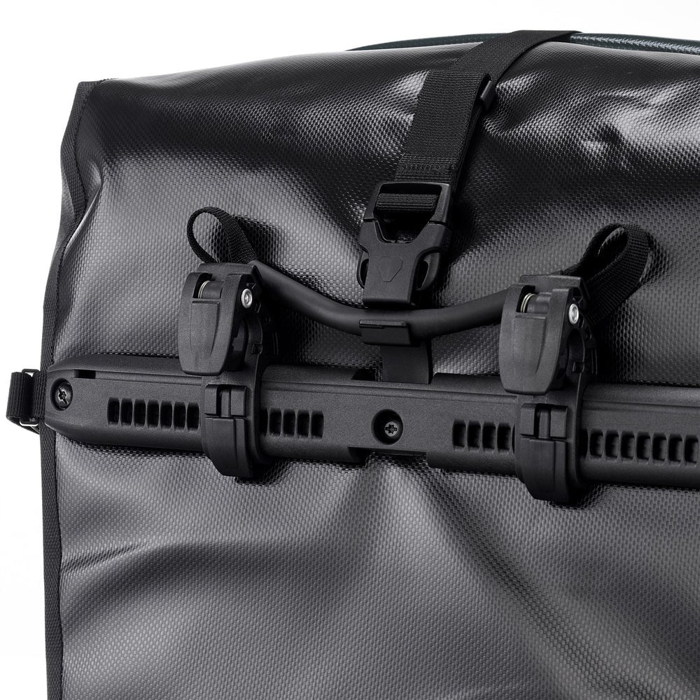 U bevestigt deze Back-Roller XL gemakkelijk met de nieuwe Quick-Lock 2.2-haken aan de bagagedrager van uw fiets. Als u aan het handvat trekt dat gekoppeld is aan het kliksysteem, klikken de anti-kras haken weer los van de bagagedragerbuis. De QL2.2-haken passen op bagagedragers met een buisdiameter van 8 tot 16 mm. De grootte van de haken kan zonder gereedschap individueel worden aangepast, om ze passend te maken voor dragers met een buisdiameter van 10, 12, 14 en 16 mm. Losse inserts zijn dus niet meer nodig. Door de draaibare houderrail onderaan kan de tas zowel links als rechts aan uw fiets worden bevestigd. Klik hier voor meer informatie over het Quick-Lock-systeem van Ortlieb.