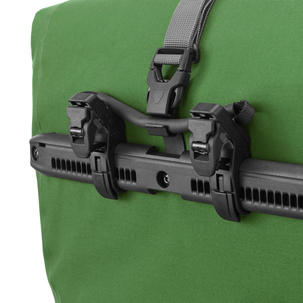 U bevestigt deze Back-Roller Plus gemakkelijk met de nieuwe Quick-Lock 2.2-haken aan de bagagedrager van uw fiets. Als u aan het handvat trekt dat gekoppeld is aan het kliksysteem, klikken de anti-kras haken weer los van de bagagedragerbuis. De QL2.2-haken passen op bagagedragers met een buisdiameter van 8 tot 16 mm. De grootte van de haken kan zonder gereedschap individueel worden aangepast, om ze passend te maken voor dragers met een buisdiameter van 10, 12, 14 en 16 mm. Losse inserts zijn dus niet meer nodig. Door de draaibare houderrail onderaan kan de tas zowel links als rechts aan uw fiets worden bevestigd. Klik hier voor meer informatie over het Quick-Lock-systeem van Ortlieb.