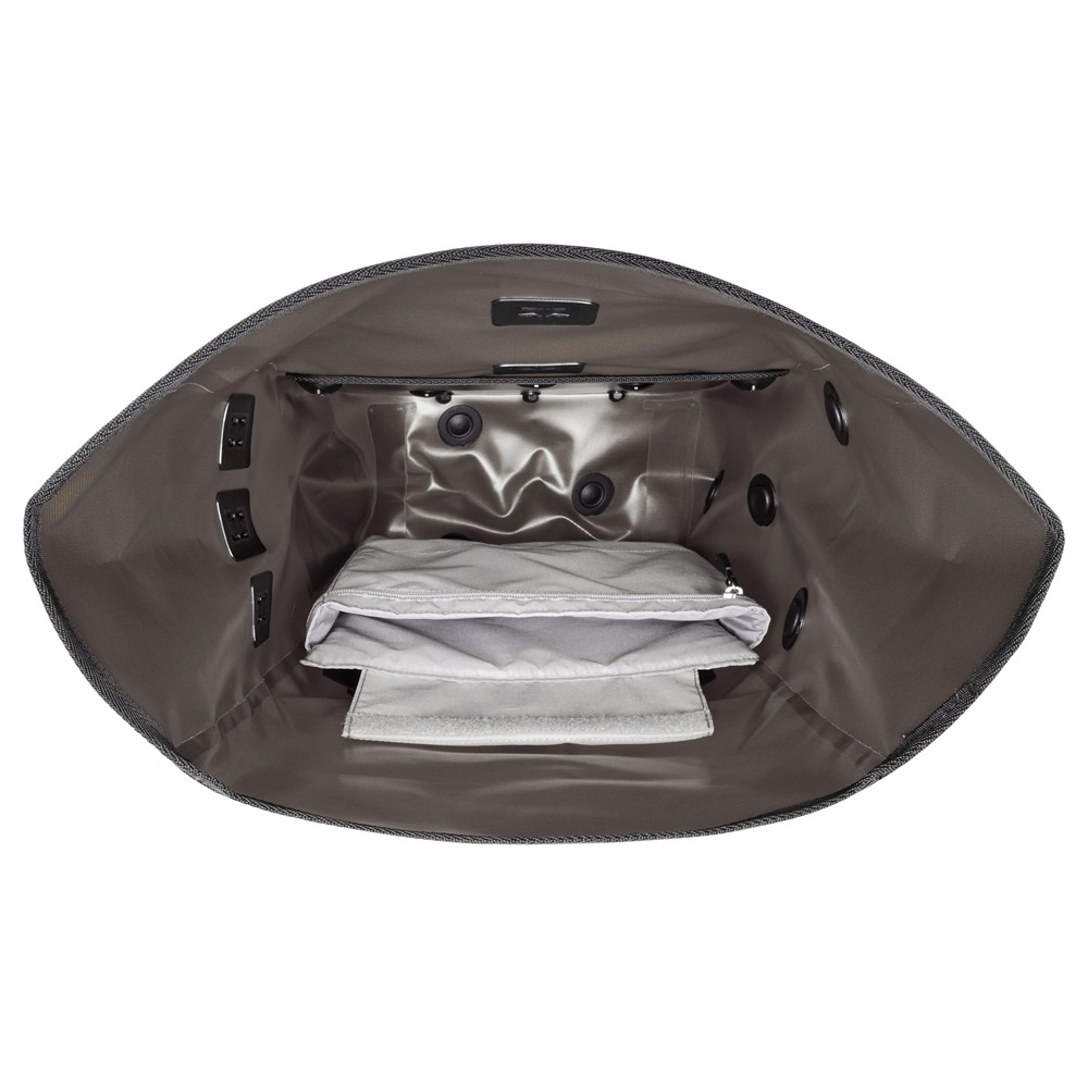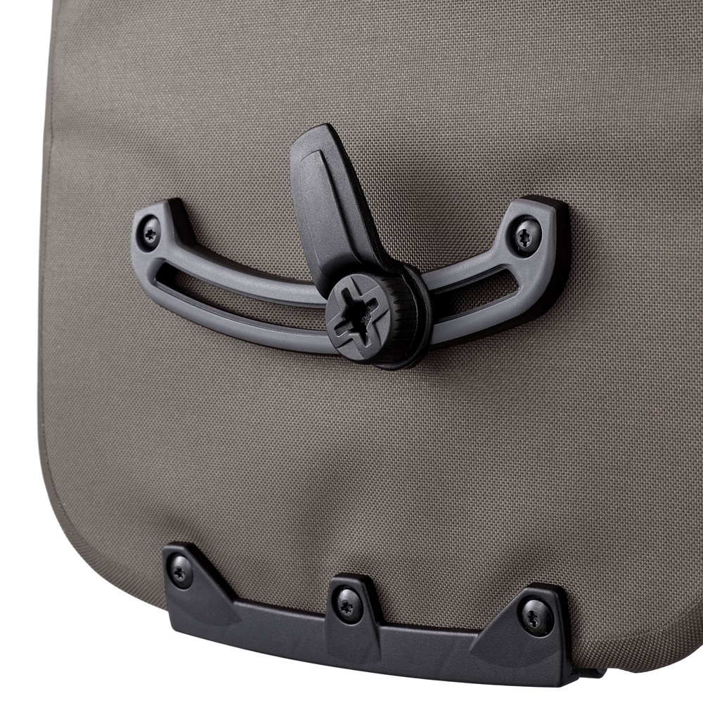 De vernieuwde tas Vario is aan een kant voorzien van het Quick-Lock 2.1 bevestigingssysteem en aan de andere kant van een gewatteerd draagsysteem met borstband en ergonomisch gevormde schouderbanden. Deze schouderbanden zijn afgewerkt met reflecterend garen. Met een flap met daarin een ritsvak bedekt u de kant van de tas die u niet gebruikt. Deze flap kan van kant wisselen en wordt vastgezet met een metalen haak.