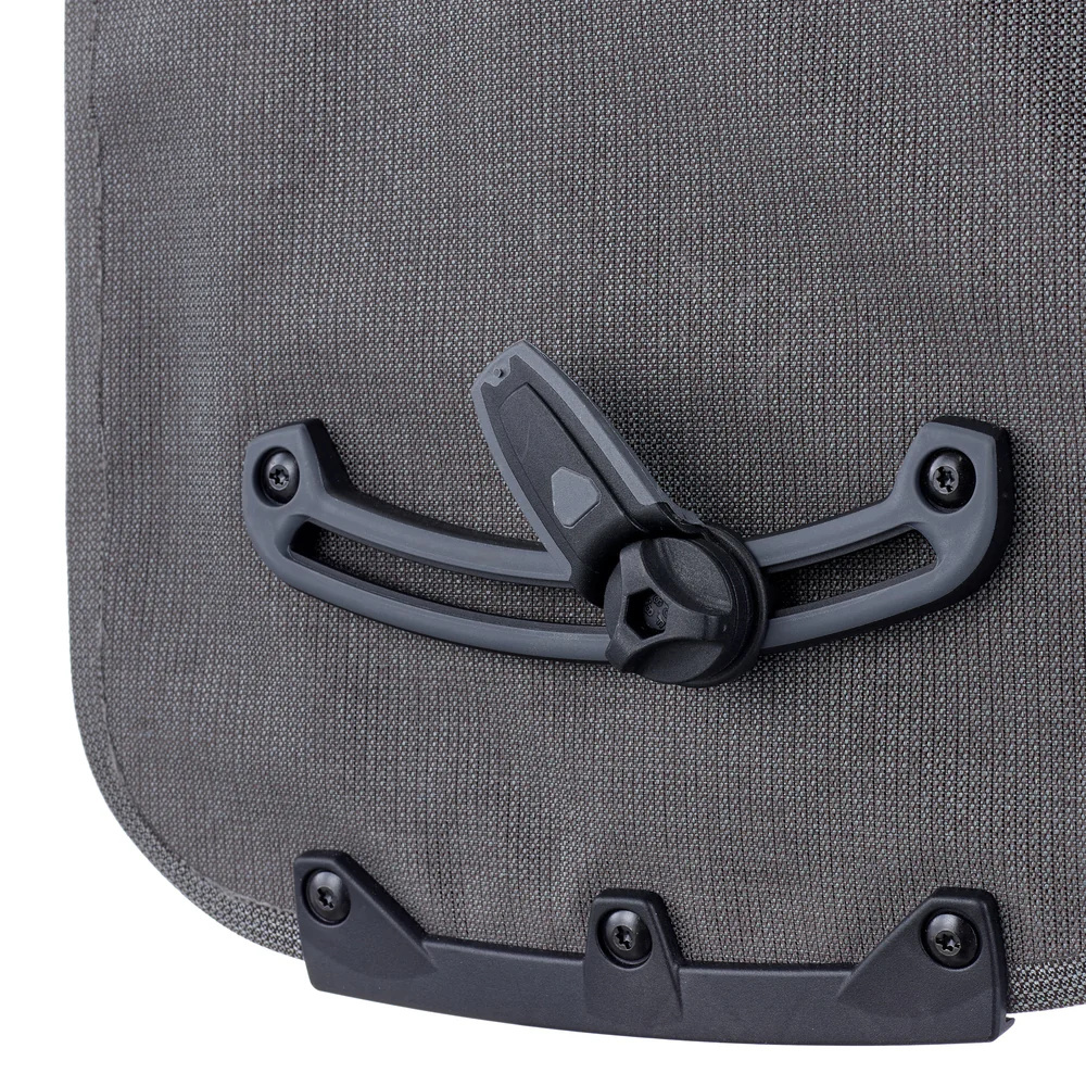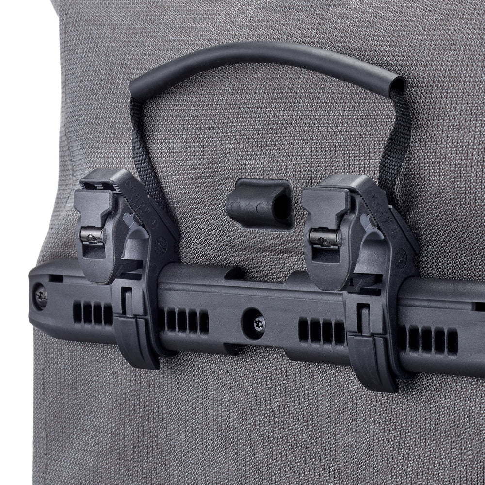 U bevestigt fietstas Vario Urban gemakkelijk met de nieuwe Quick-Lock 2.2-haken aan de bagagedrager van uw fiets. Als u aan het handvat trekt dat gekoppeld is aan het kliksysteem, klikken de anti-kras haken weer los van de bagagedragerbuis. De QL2.2-haken passen op bagagedragers met een buisdiameter van 8 tot 16 mm. De grootte van de haken kan zonder gereedschap individueel worden aangepast, om ze passend te maken voor dragers met een buisdiameter van 10, 12, 14 en 16 mm. Losse inserts zijn dus niet meer nodig. Door de draaibare houderrail onderaan kan de tas zowel links als rechts aan uw fiets worden bevestigd. Klik hier voor meer informatie over het Quick-Lock-systeem van Ortlieb.