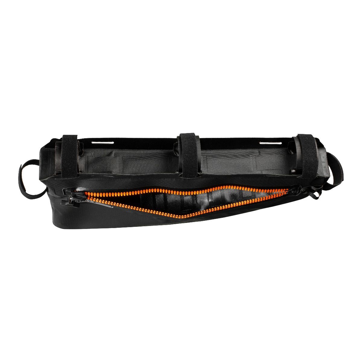 De frame-pack is aan de rechterzijde voorzien van een waterdichte TIZIP-ritssluiting. Binnenin de tas zit klittenband, wat opbollen van de tas helpt voorkomen. De tas is gemaakt van PU-gecoat nylon en is daardoor waterdicht. Let op: om de tas 100% stof- en waterdicht te maken (beschermingsgraad IP67), moet de ritssluiting volledig gesloten zijn. De frametas is in dat geval zelfs beschermd tegen korte onderdompeling onder water. Aan beide zijden van de frame-pack vindt u een reflecterend logo, voor extra zichtbaarheid in het verkeer.