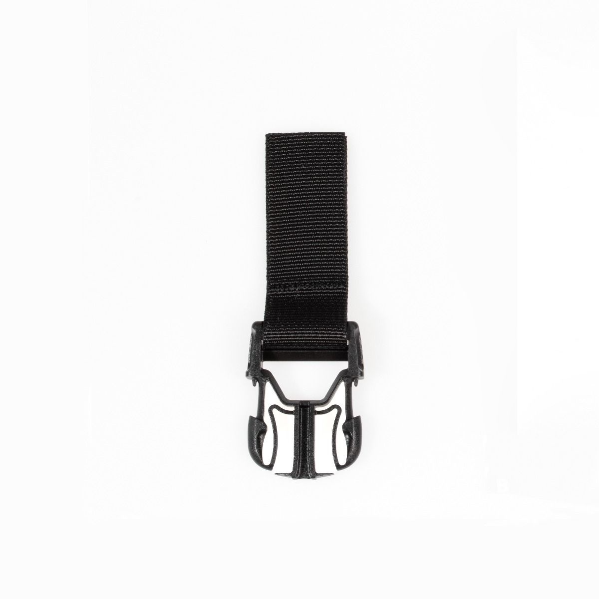 Een zwarte kunststof steeksluiting Stealth (25 mm) met band, om een kapotte stekker van een klikgesp te vervangen. De kliksluiting kan met de band worden aangenaaid. Geschikt voor alle Office-Bags van Ortlieb vanaf 1999.
