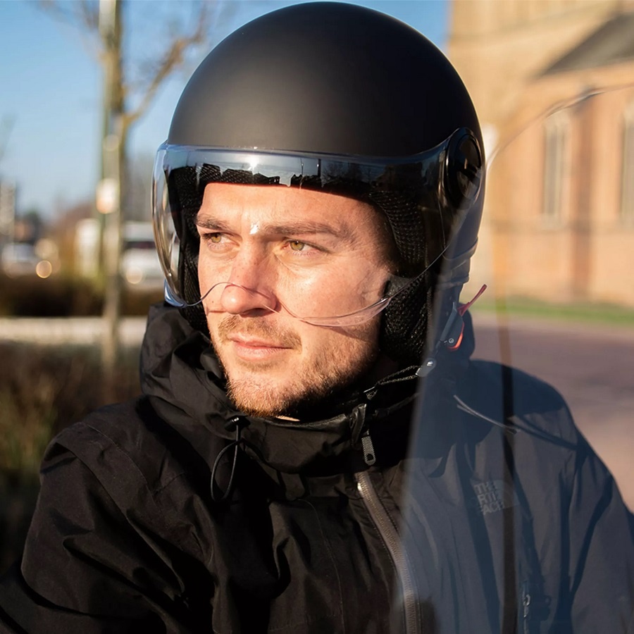 De matzwarte helm heeft een geïntegreerd vizier, wat erg prettig is wanneer u met hoge snelheid rijdt. Het krasbestendige, beweegbare vizier biedt u goede bescherming en zorgt voor goed zicht op de weg en het verkeer.