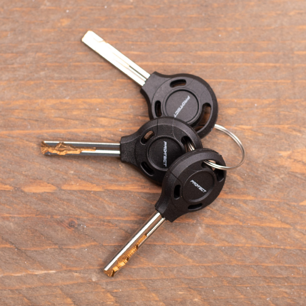 De twee lussen van de kabel zet u vast met het mini-beugelslot en de drie bijbehorende sleutels. Het kabelslot is voorzien van een beschermlaag rond de kabel, om beschadigingen te voorkomen.