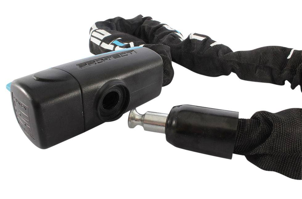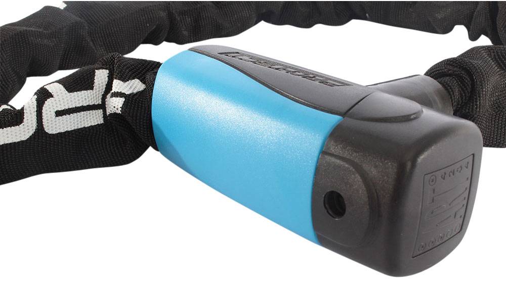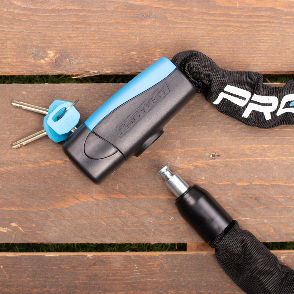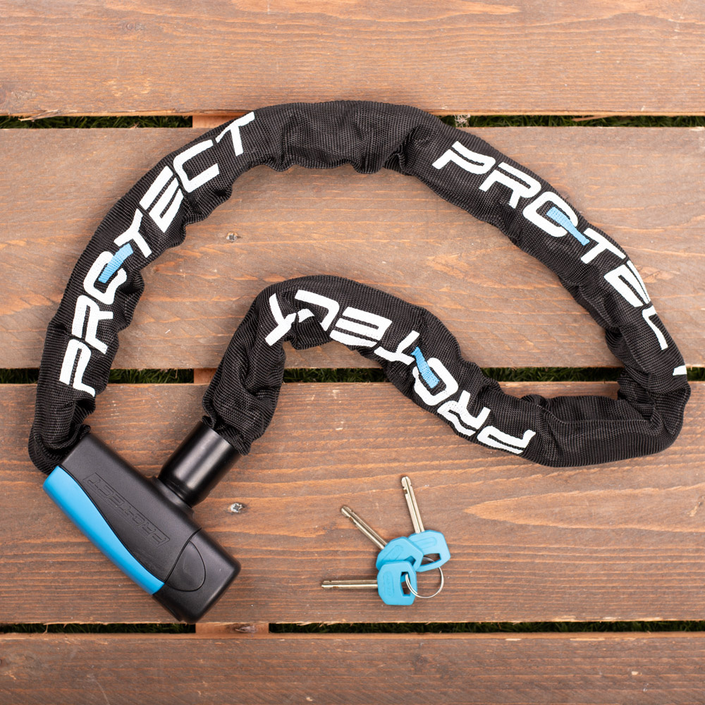 De nylon hoes om dit kettingslot die het framelak van uw waardevolle fiets, brommer of scooter tegen krasjes beschermt, is net als de krachtige behuizing in de traditionele kleur zwart. Dit gecombineerd met blauwe elementen, zoals de in totaal drie meegeleverde sleutels: conform de Pro-tect huisstijl. Passend bij een gecertificeerd slot van prima kwaliteit, dat óók beschikbaar is voor iemand met een iets lager budget.